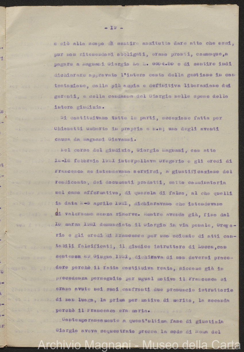 Causa Giorgio Magnani - sentenze - corrispondenza e comparse - Gregorio Magnani - Giuseppe Lumbroso - Giulio Buonamici - Amilcare Galeotti - Francesco Pacelli - Francesco Bandoni - Piero Magnani - Agostino Magnani - Leopoldo Lazzereschi