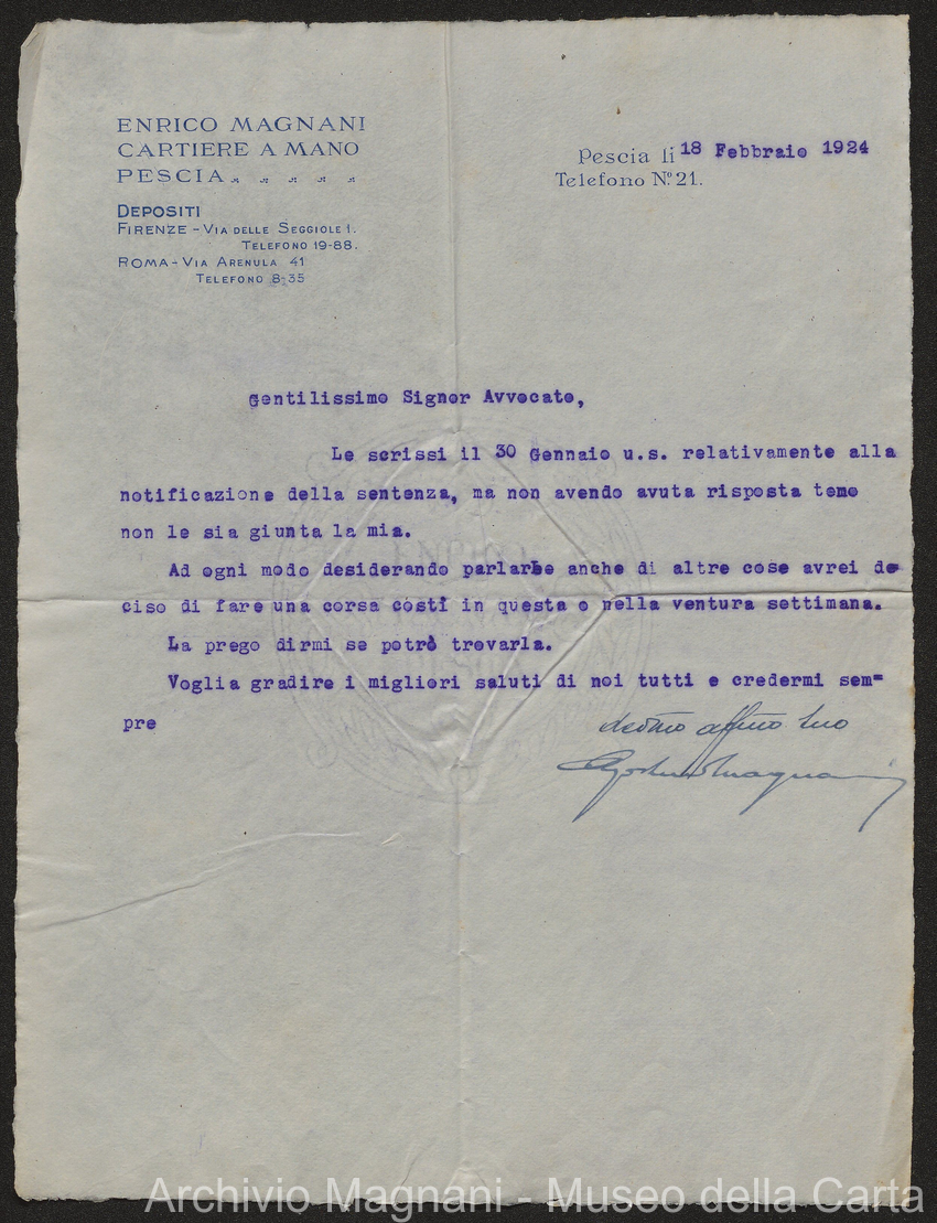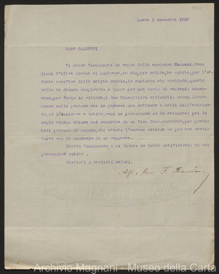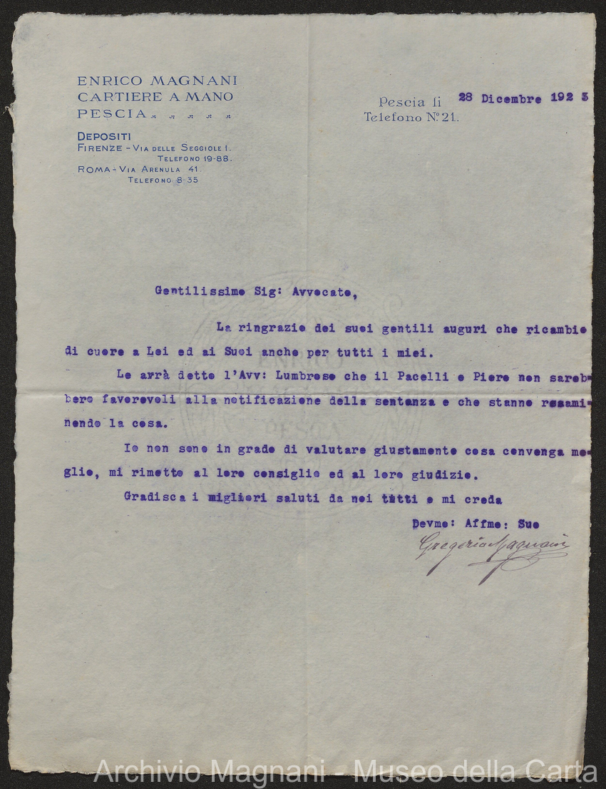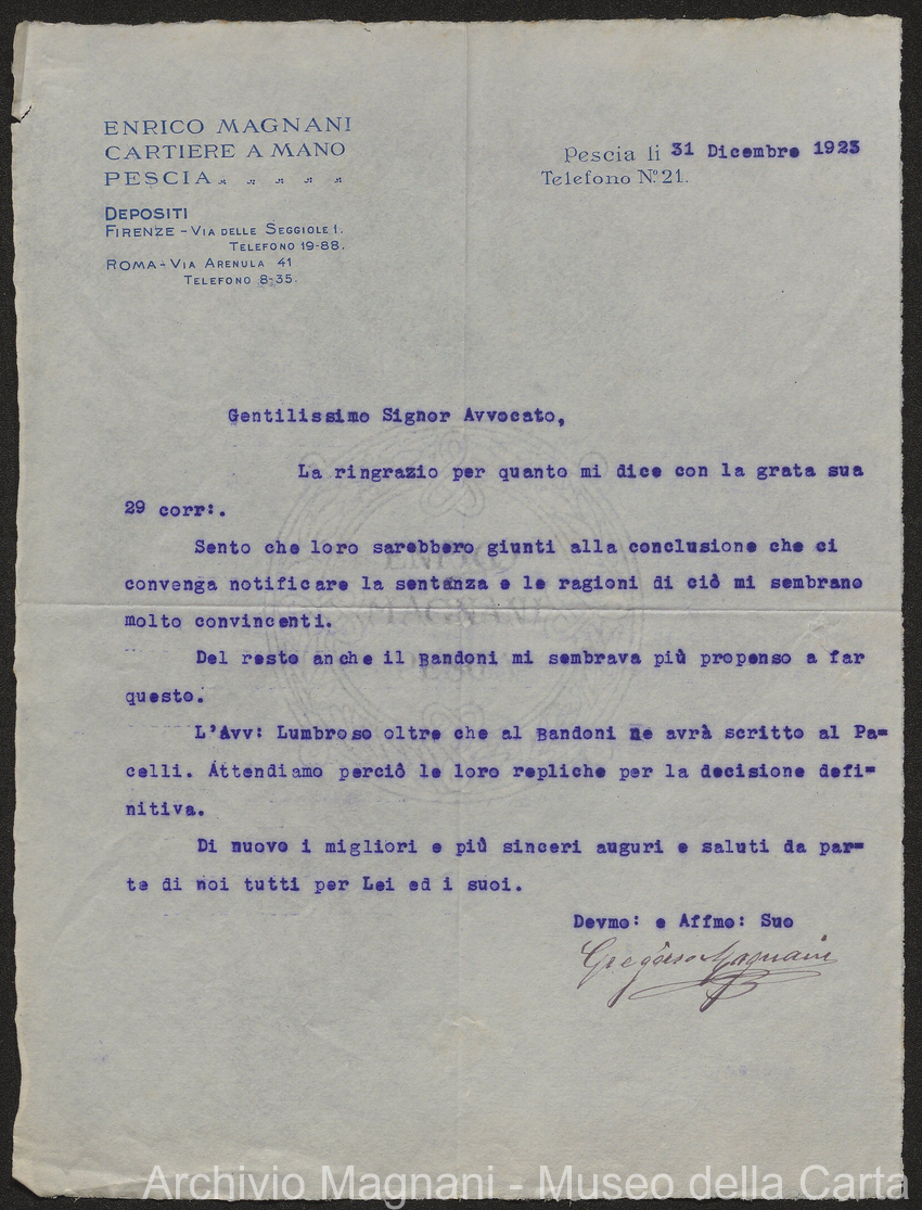 Causa Giorgio Magnani - sentenze - corrispondenza e comparse - Gregorio Magnani - Giuseppe Lumbroso - Giulio Buonamici - Amilcare Galeotti - Francesco Pacelli - Francesco Bandoni - Piero Magnani - Agostino Magnani - Leopoldo Lazzereschi