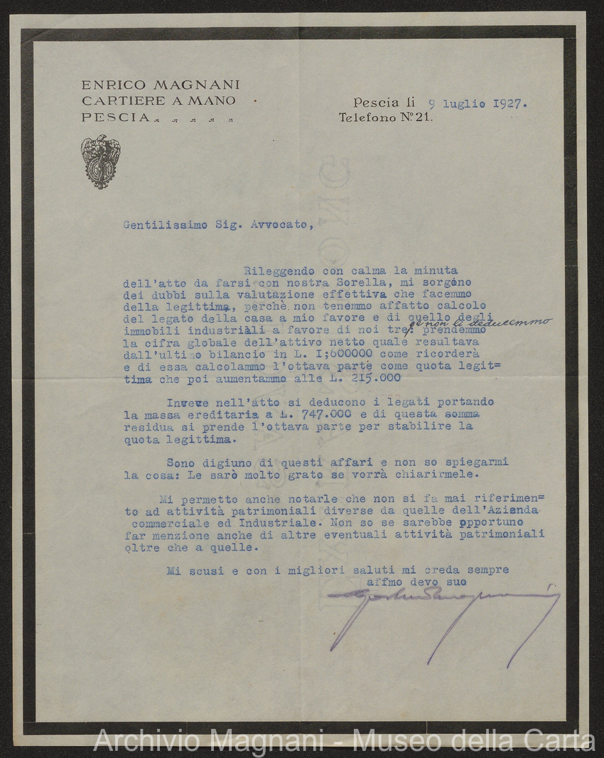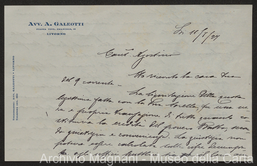 Sentenze a stampa, 1917 e s.d., pp. 2-159; "Cessioni del fallimento di Giorgio", 1913-19, pp. 160-186; "Corrispondenza con l'Avv. A. Galeotti e altri", 1922-32 e 1 s.d. (ante 1927), pp. 187-605; "Enrico Magnani. Carte diverse", 1927 e 6 s.d., pp. 606-622.
