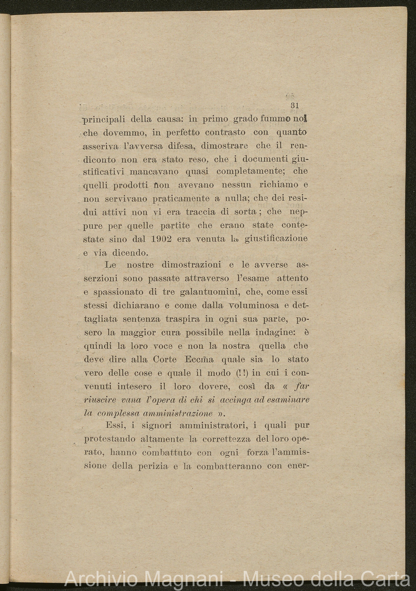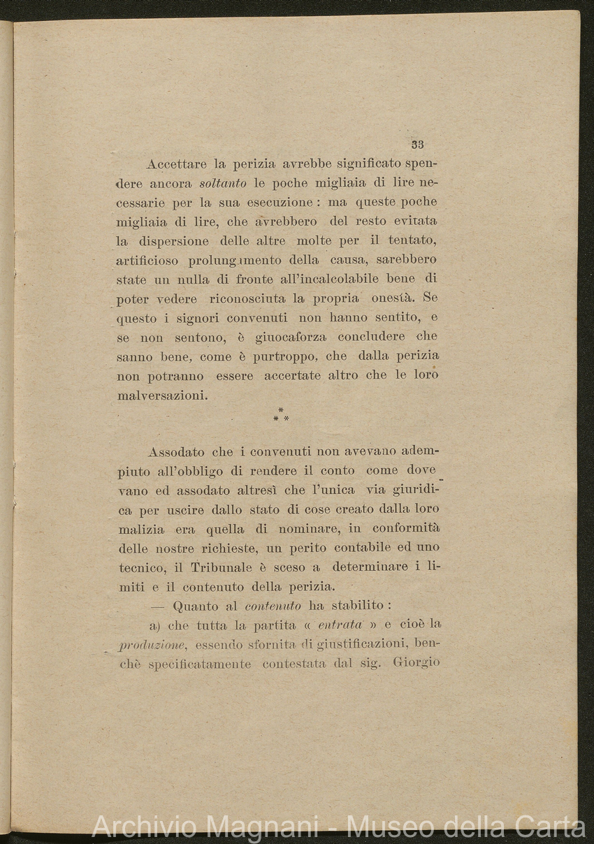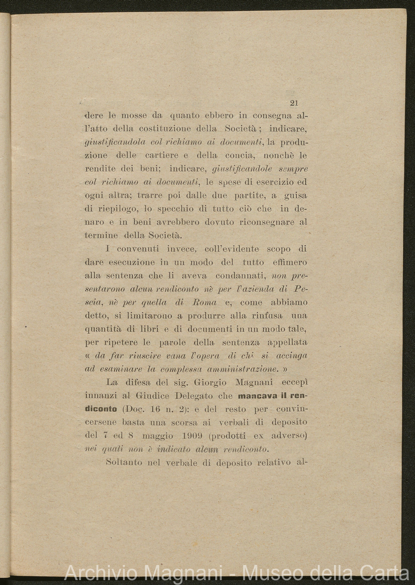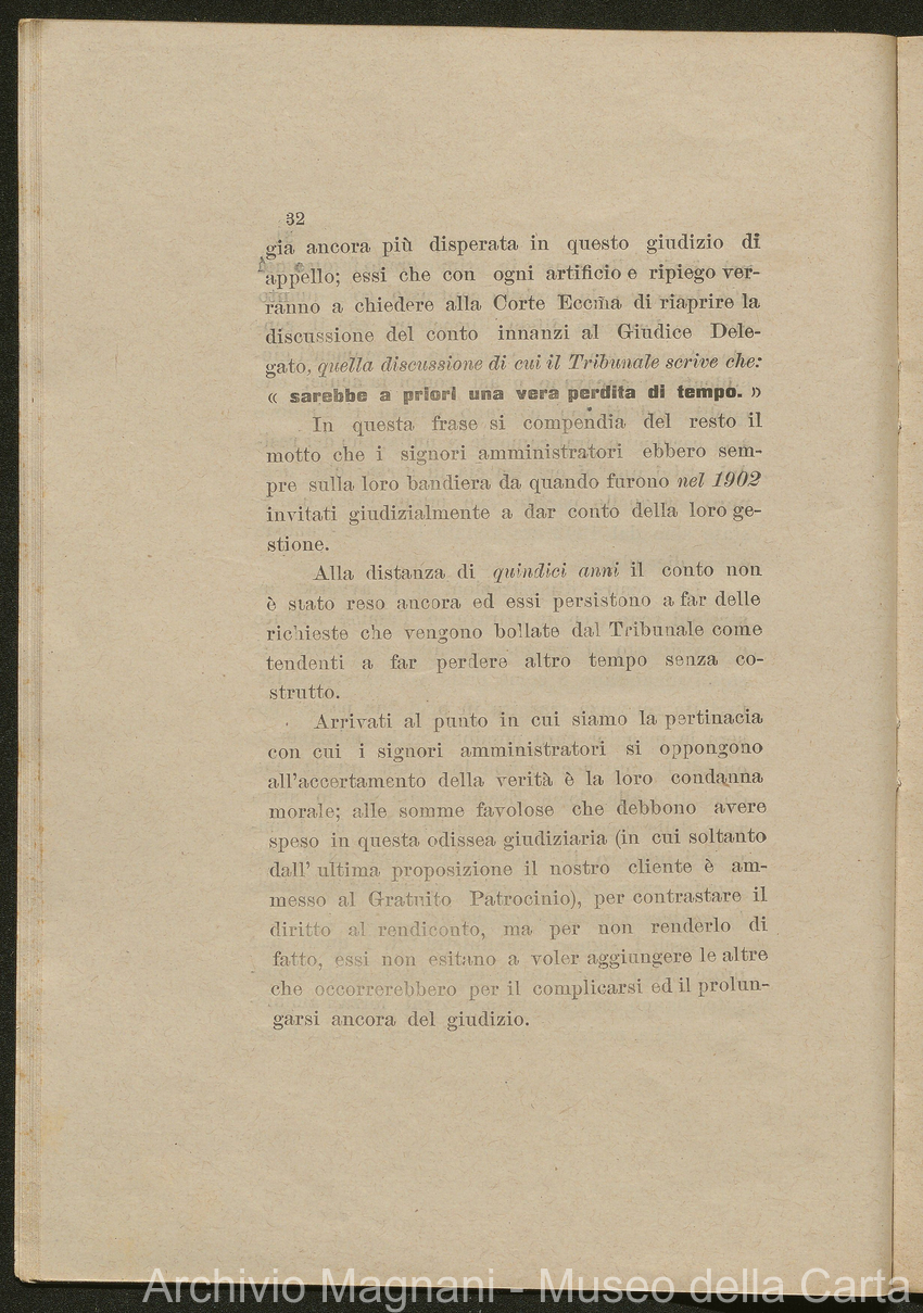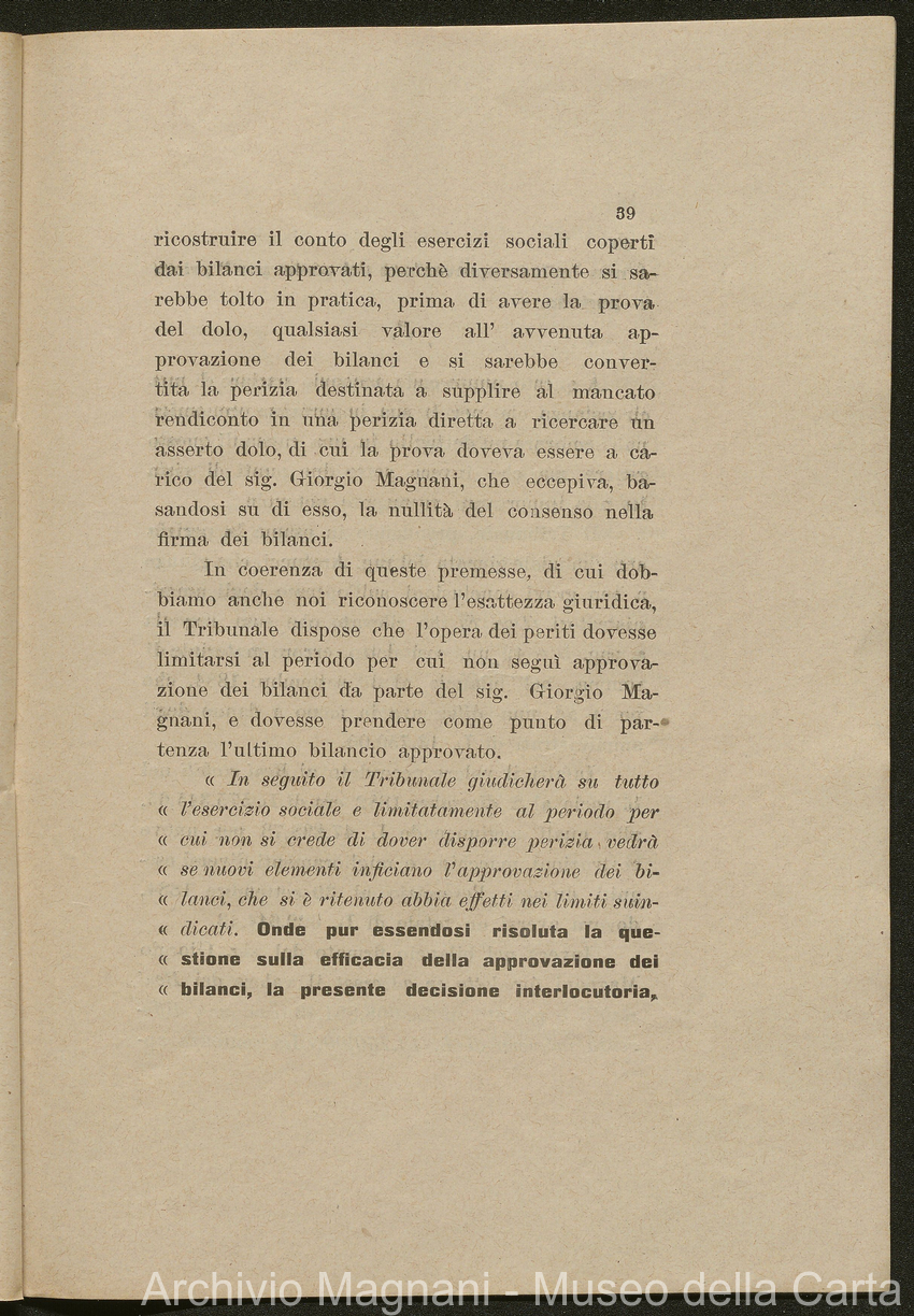 Sentenze a stampa, 1917 e s.d., pp. 2-159; "Cessioni del fallimento di Giorgio", 1913-19, pp. 160-186; "Corrispondenza con l'Avv. A. Galeotti e altri", 1922-32 e 1 s.d. (ante 1927), pp. 187-605; "Enrico Magnani. Carte diverse", 1927 e 6 s.d., pp. 606-622.