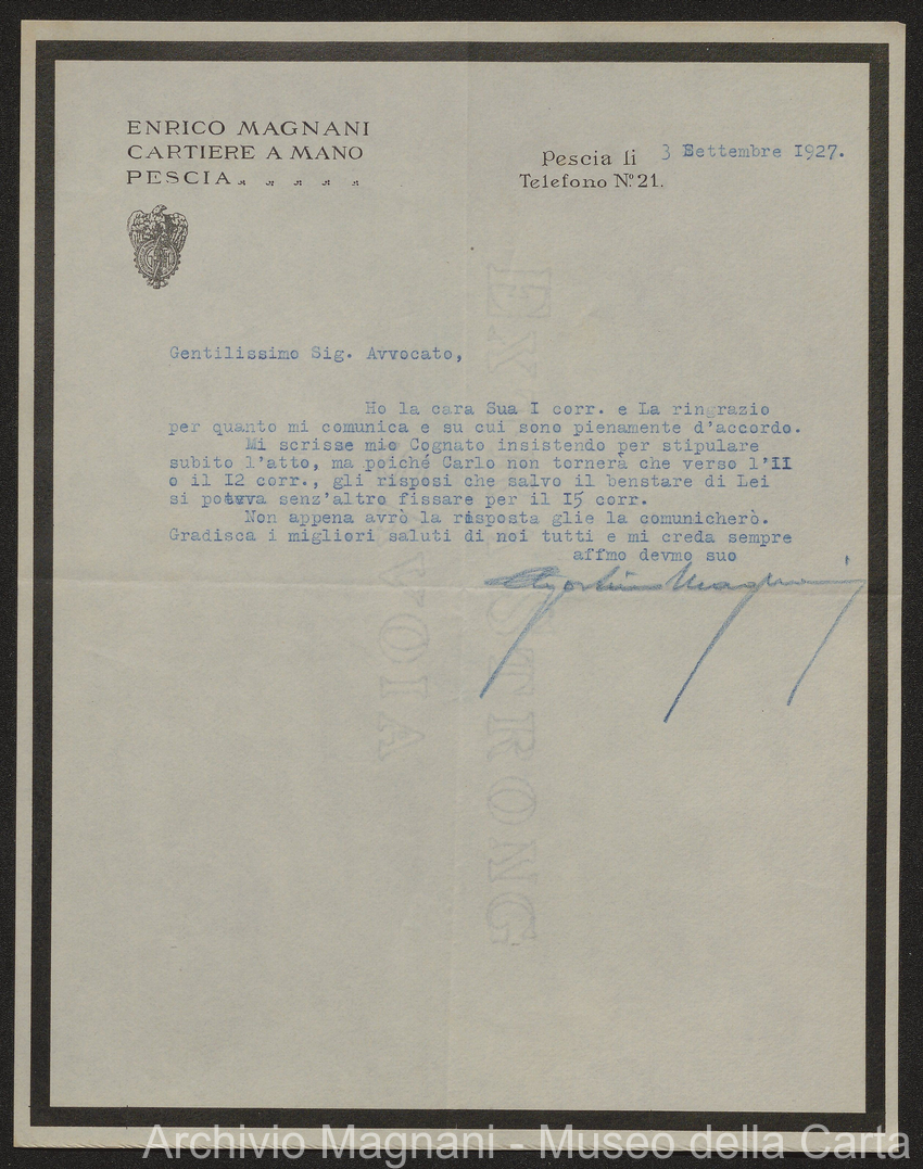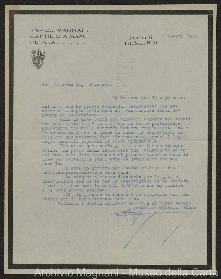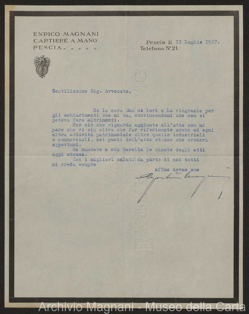 Sentenze a stampa, 1917 e s.d., pp. 2-159; "Cessioni del fallimento di Giorgio", 1913-19, pp. 160-186; "Corrispondenza con l'Avv. A. Galeotti e altri", 1922-32 e 1 s.d. (ante 1927), pp. 187-605; "Enrico Magnani. Carte diverse", 1927 e 6 s.d., pp. 606-622.