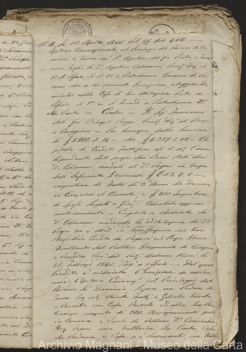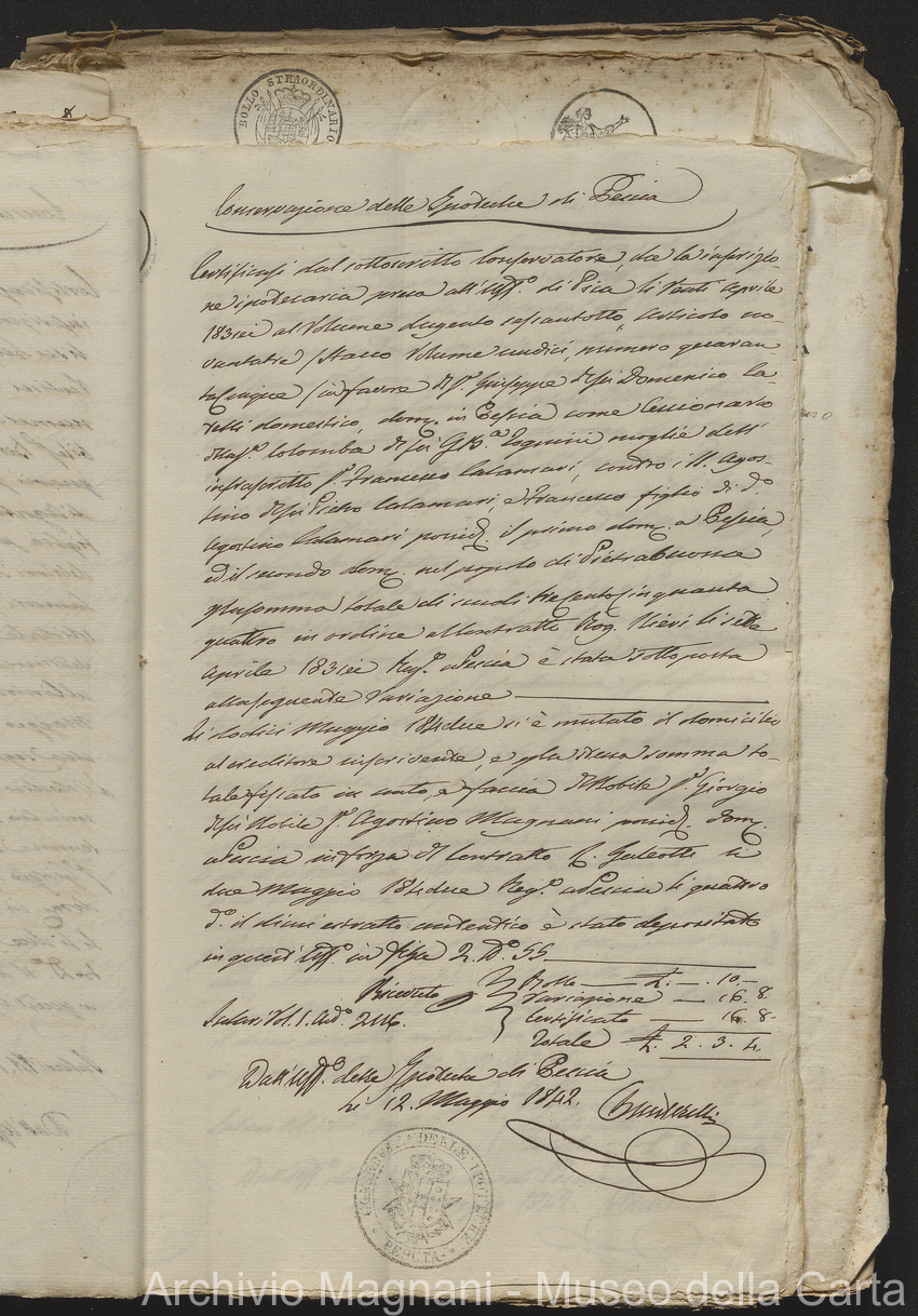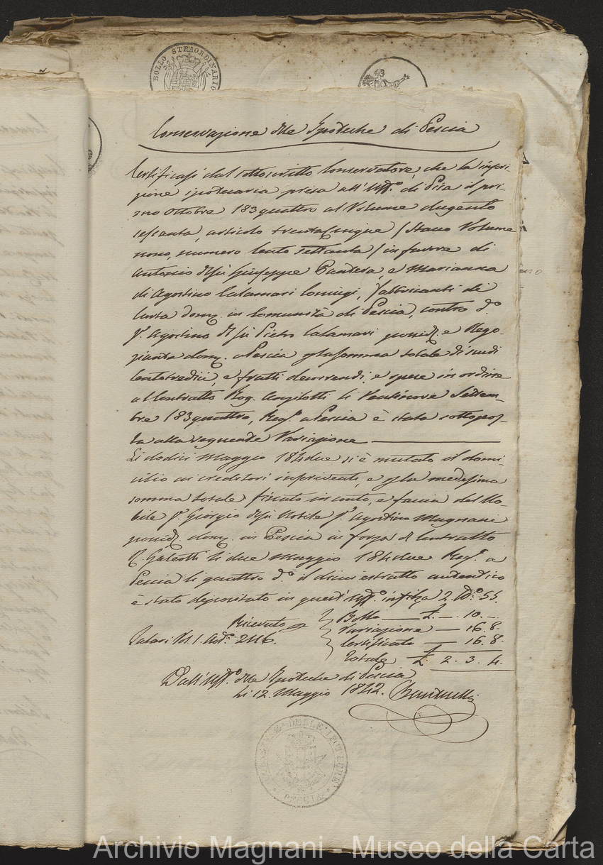Filza di contr. di prestito, note di credito ipotecario, conserv. ipoteche di Lucca e di Pescia, 2 campioni del catasto (copie), costit. e vendita di censo, cessione di credito, dimostr. graduatoria Calamari, rinuncia; pp. 19-245, di cui XLI bianche