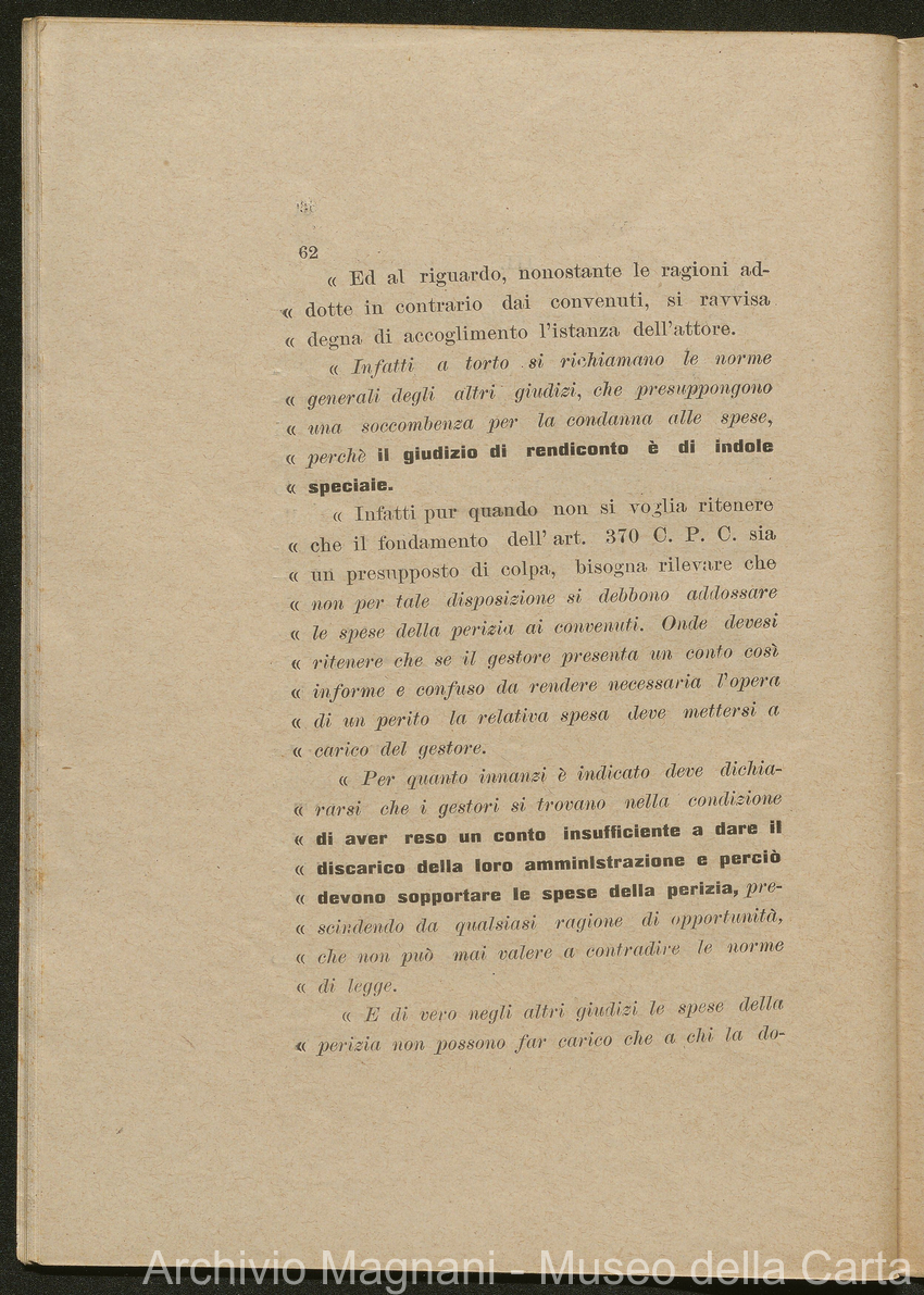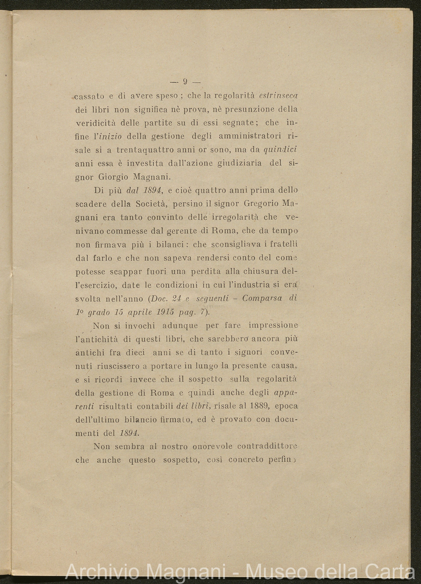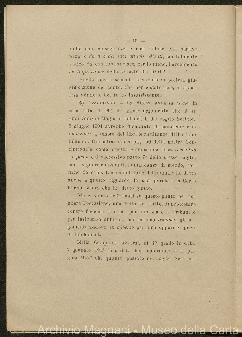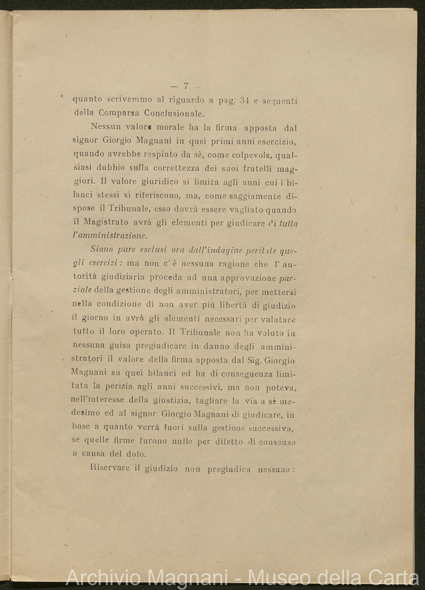 Sentenze a stampa, 1917 e s.d., pp. 2-159; "Cessioni del fallimento di Giorgio", 1913-19, pp. 160-186; "Corrispondenza con l'Avv. A. Galeotti e altri", 1922-32 e 1 s.d. (ante 1927), pp. 187-605; "Enrico Magnani. Carte diverse", 1927 e 6 s.d., pp. 606-622.