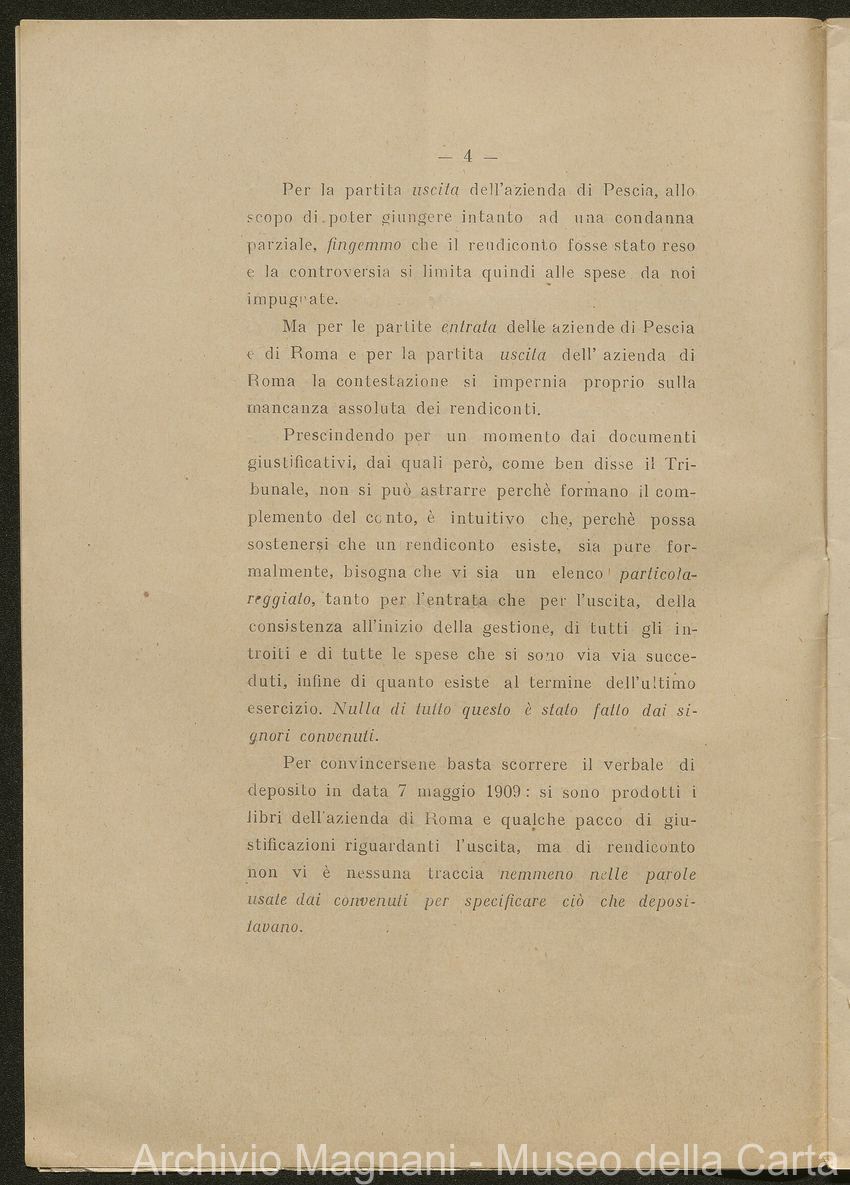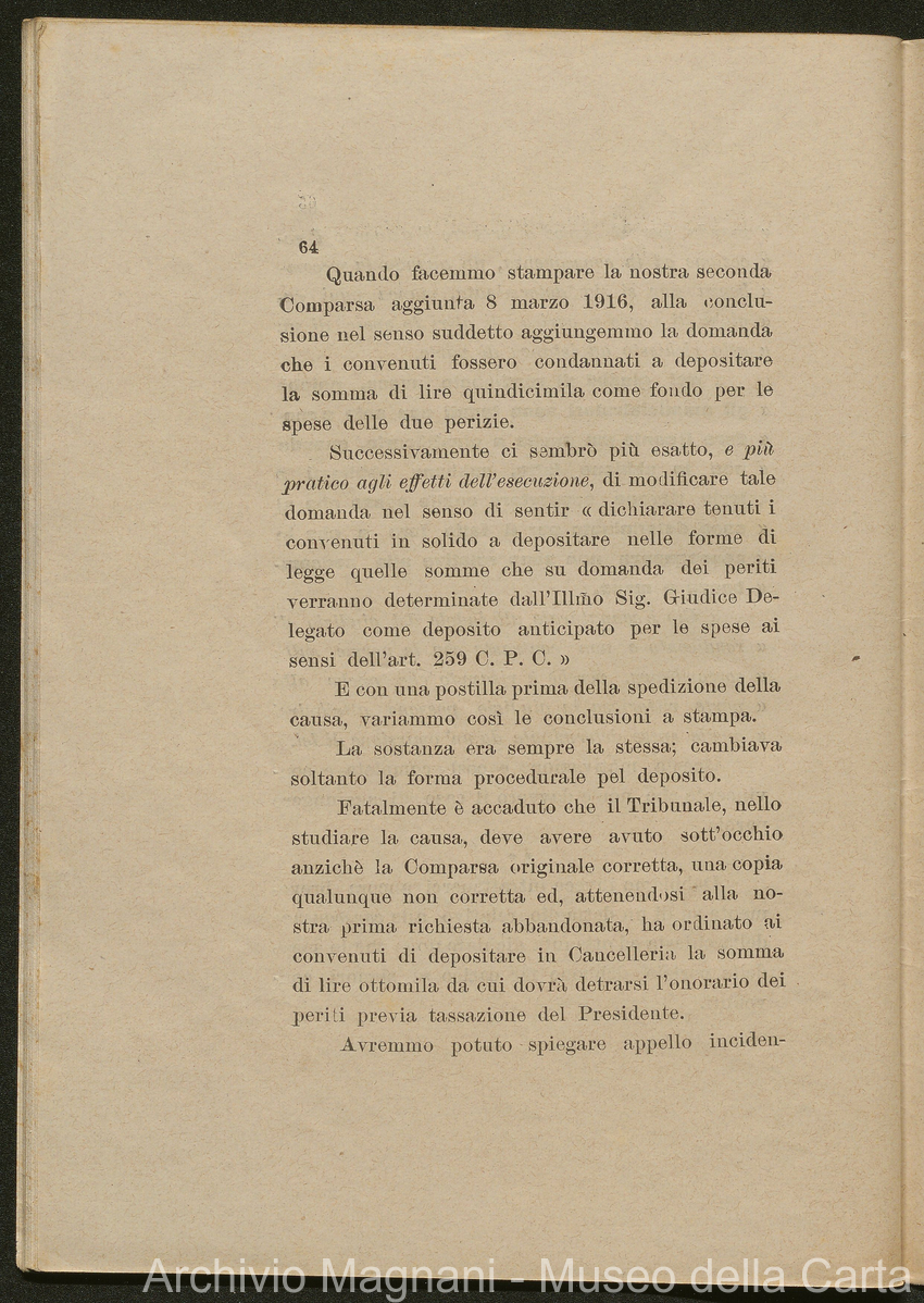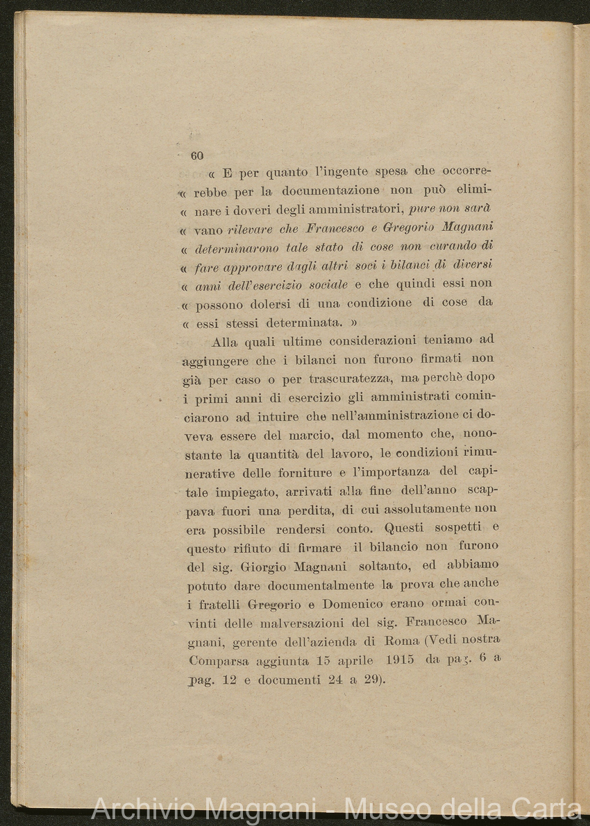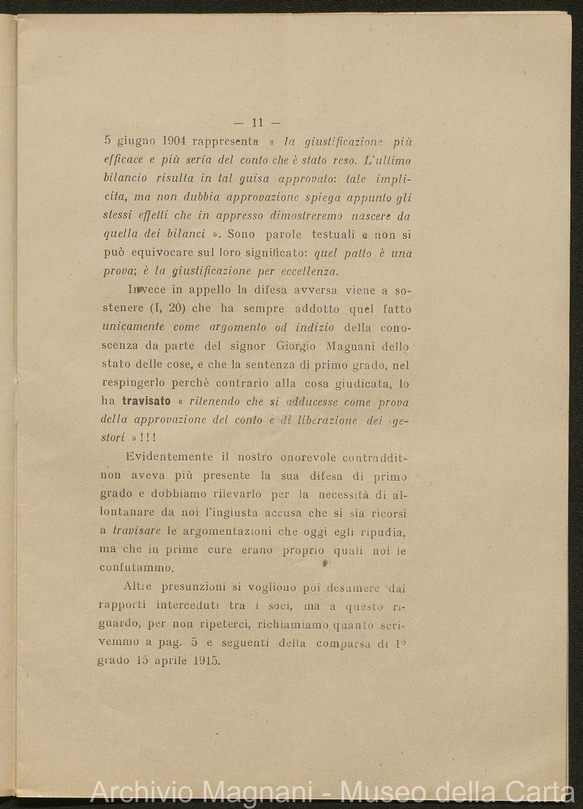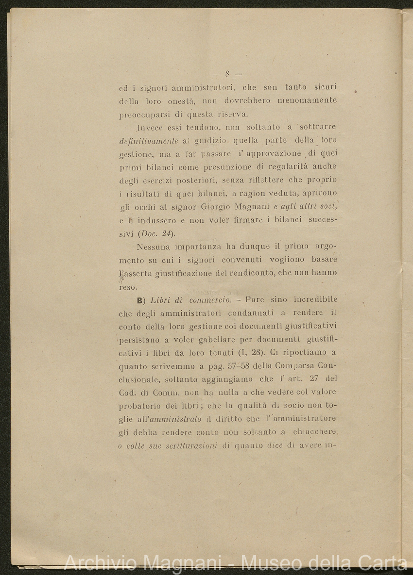 Sentenze a stampa, 1917 e s.d., pp. 2-159; "Cessioni del fallimento di Giorgio", 1913-19, pp. 160-186; "Corrispondenza con l'Avv. A. Galeotti e altri", 1922-32 e 1 s.d. (ante 1927), pp. 187-605; "Enrico Magnani. Carte diverse", 1927 e 6 s.d., pp. 606-622.