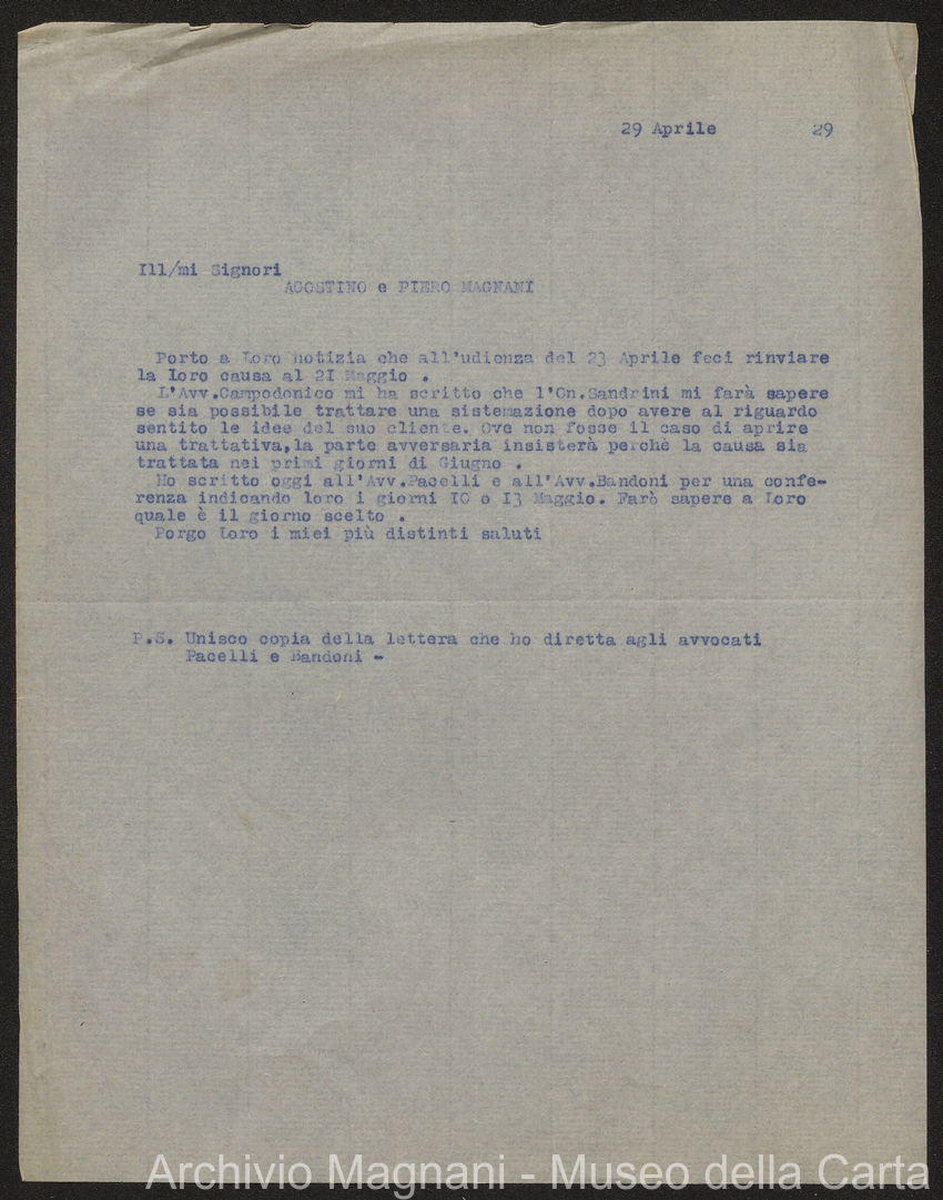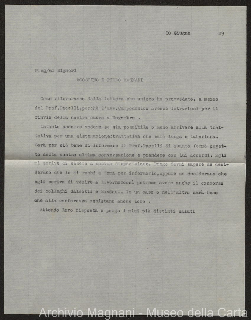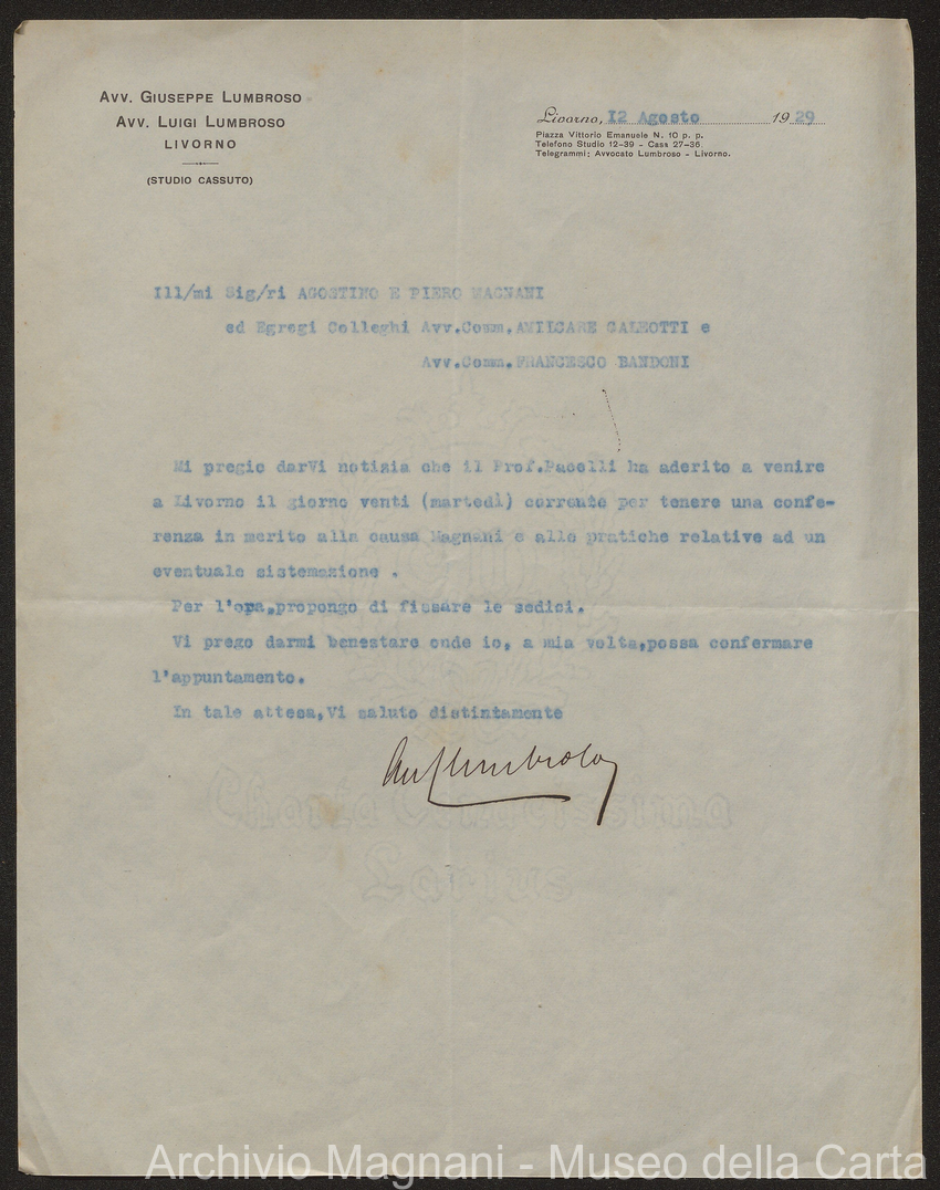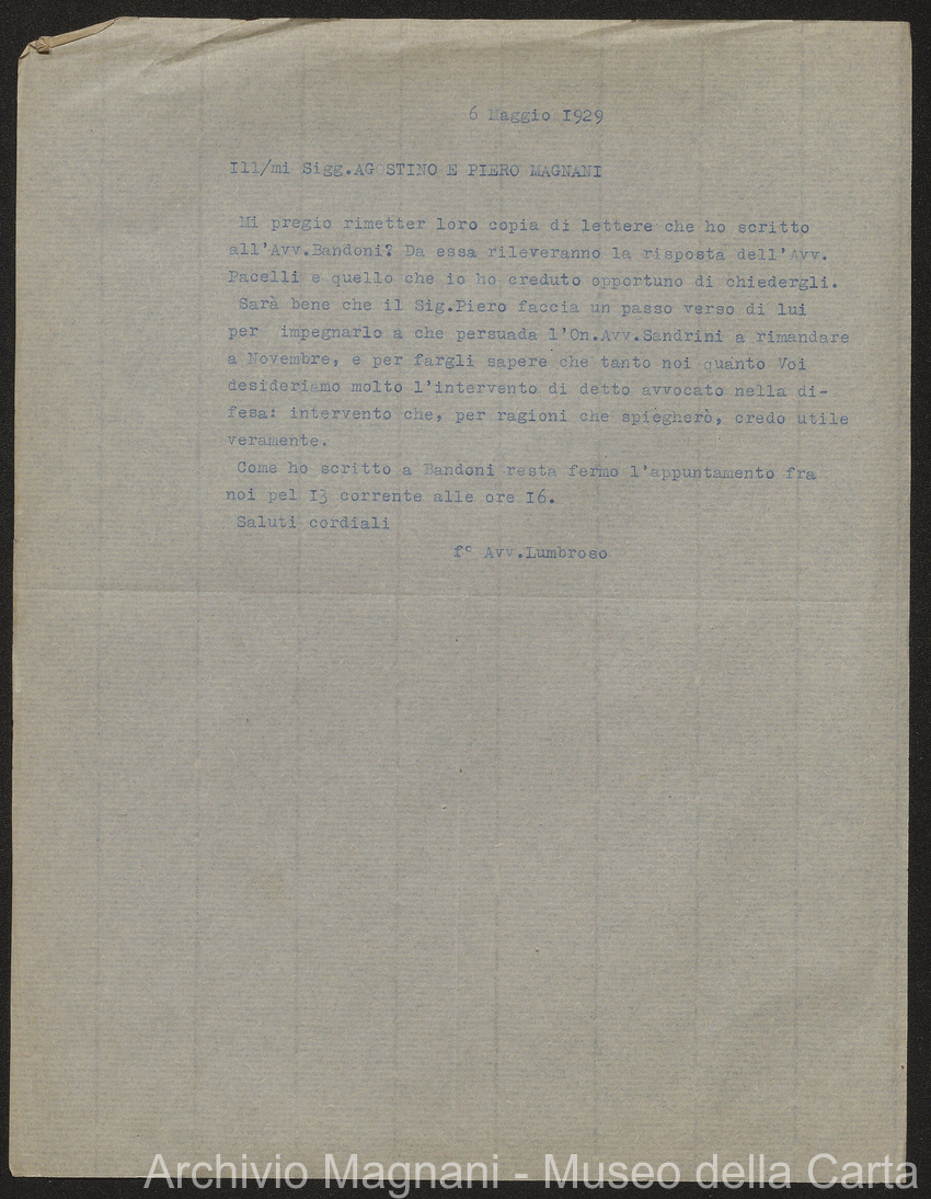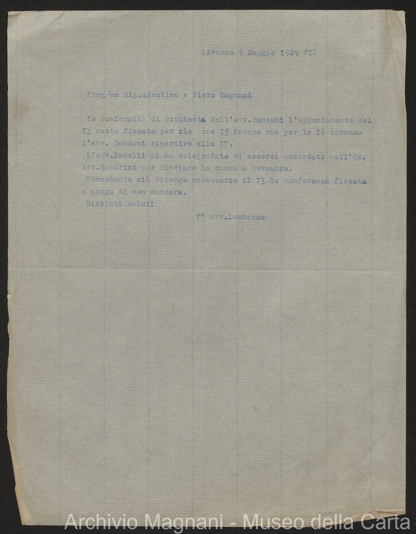 Causa Giorgio Magnani - sentenze - corrispondenza e comparse - Gregorio Magnani - Giuseppe Lumbroso - Giulio Buonamici - Amilcare Galeotti - Francesco Pacelli - Francesco Bandoni - Piero Magnani - Agostino Magnani - Leopoldo Lazzereschi