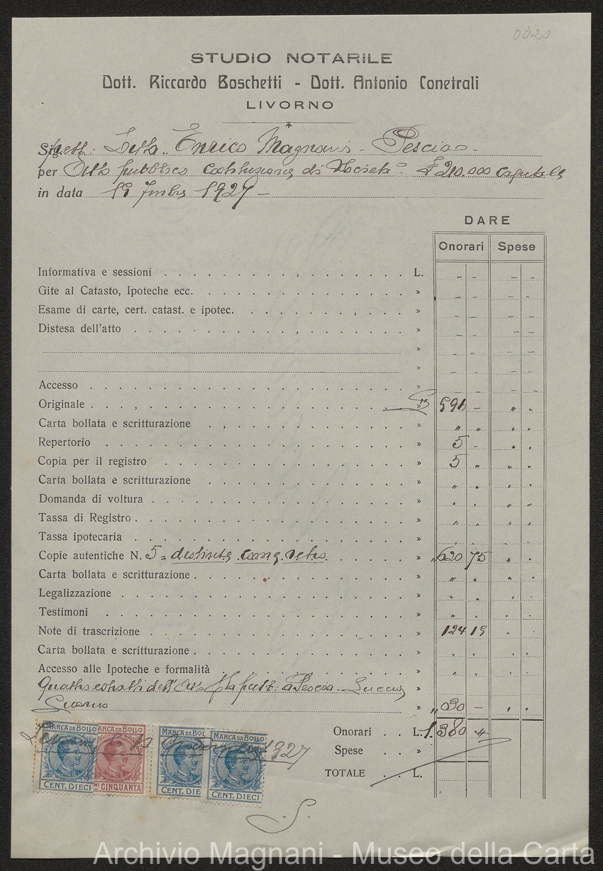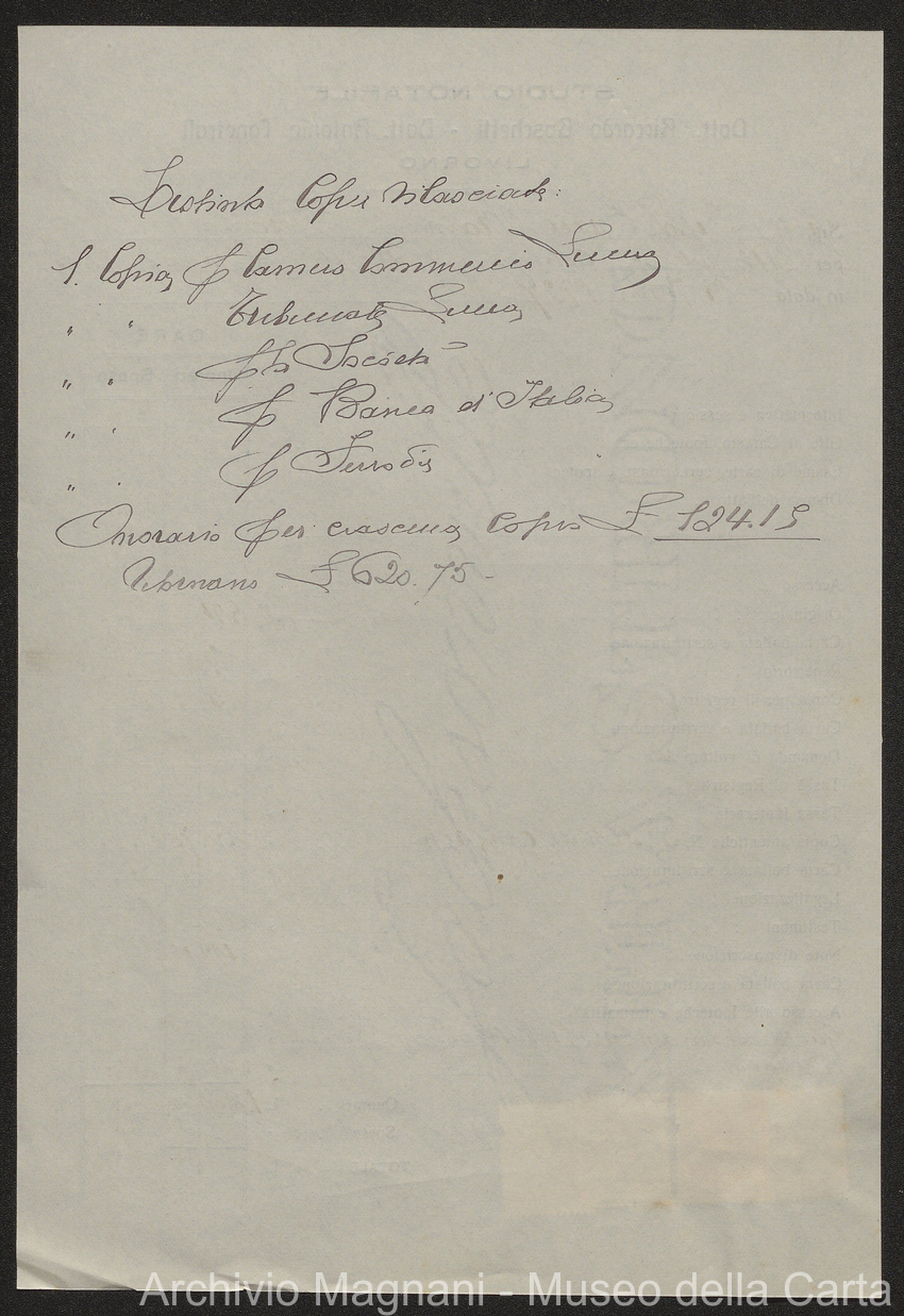 Sentenze a stampa, 1917 e s.d., pp. 2-159; "Cessioni del fallimento di Giorgio", 1913-19, pp. 160-186; "Corrispondenza con l'Avv. A. Galeotti e altri", 1922-32 e 1 s.d. (ante 1927), pp. 187-605; "Enrico Magnani. Carte diverse", 1927 e 6 s.d., pp. 606-622.