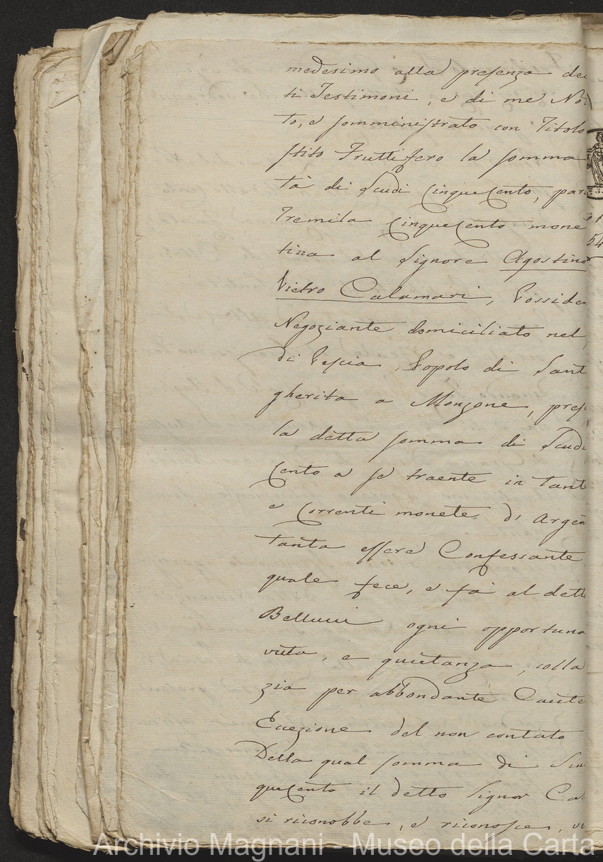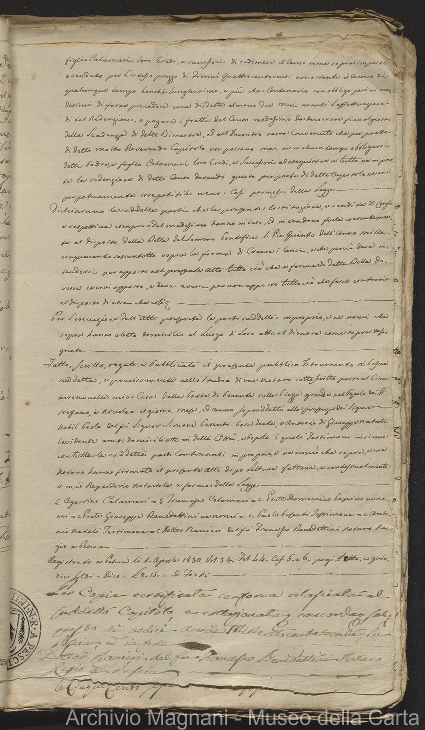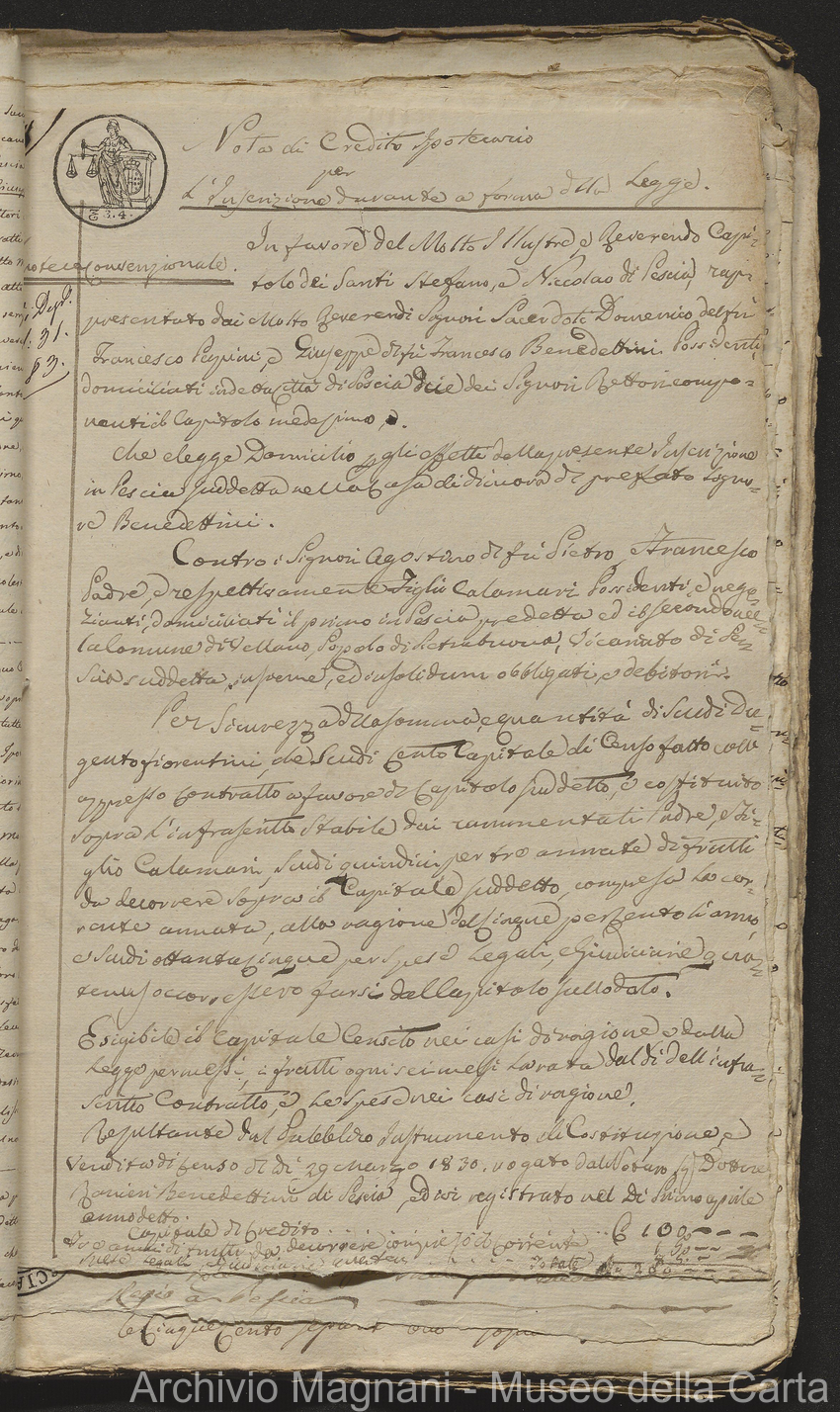 Filza di contr. di prestito, note di credito ipotecario, conserv. ipoteche di Lucca e di Pescia, 2 campioni del catasto (copie), costit. e vendita di censo, cessione di credito, dimostr. graduatoria Calamari, rinuncia; pp. 19-245, di cui XLI bianche