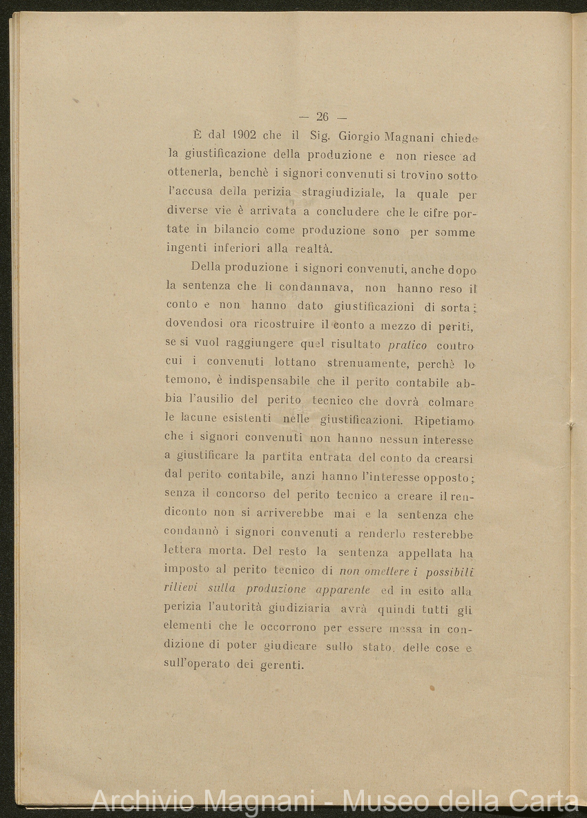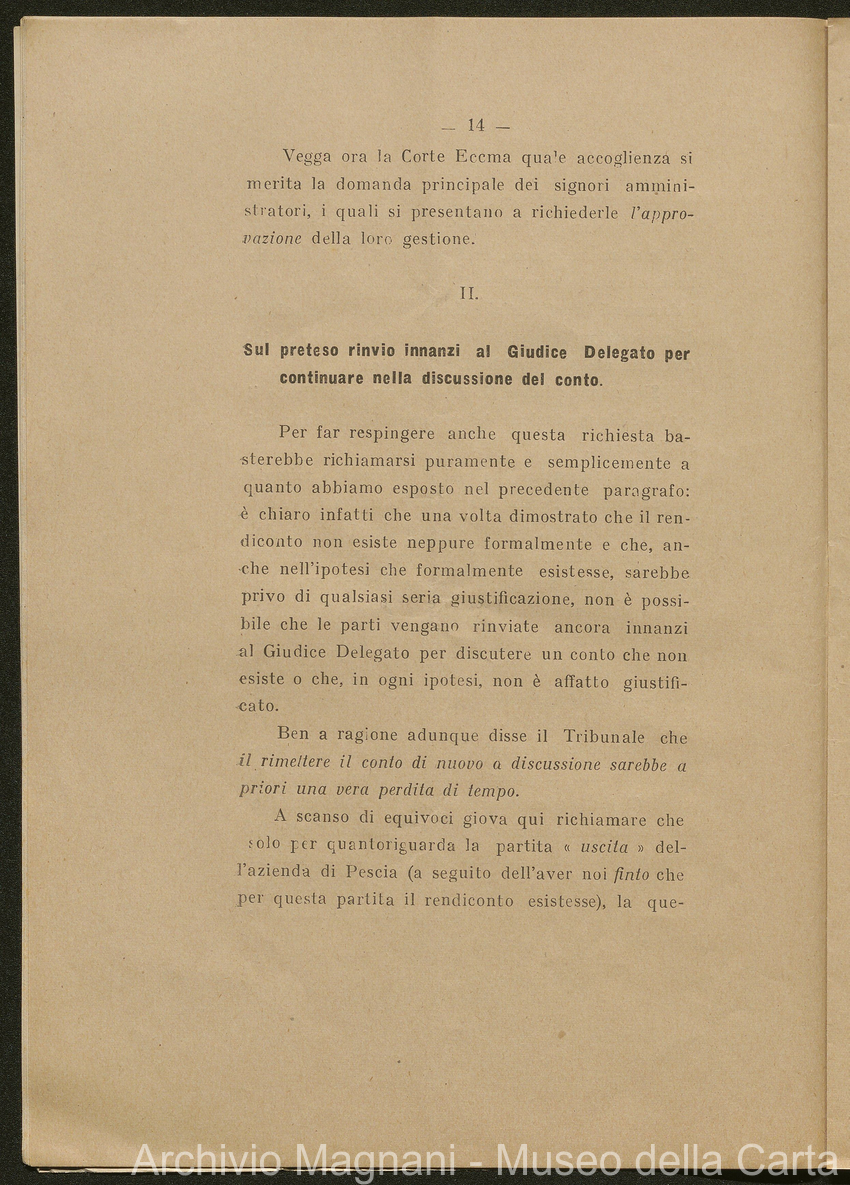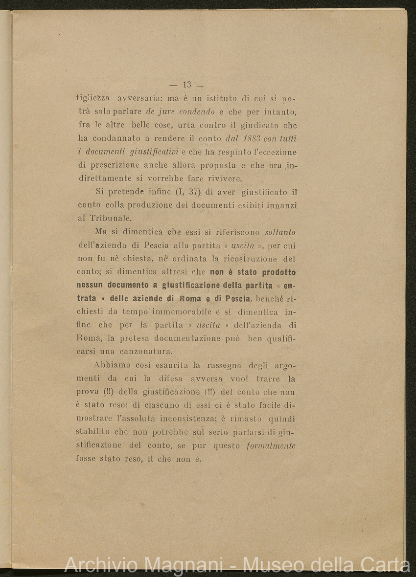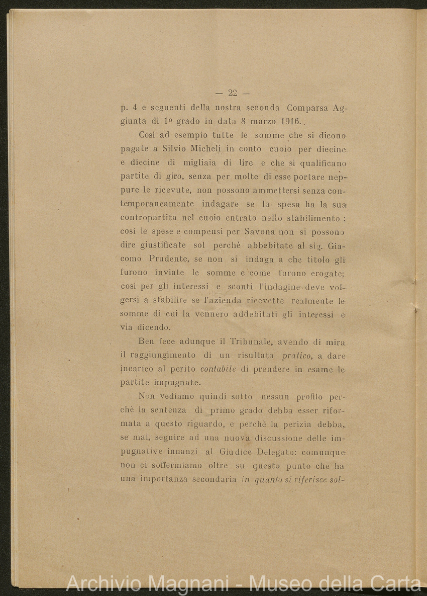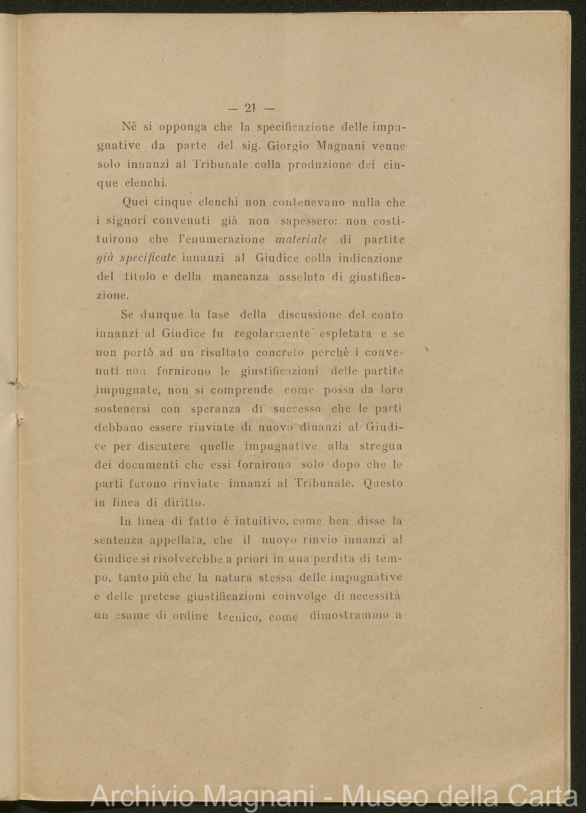 Sentenze a stampa, 1917 e s.d., pp. 2-159; "Cessioni del fallimento di Giorgio", 1913-19, pp. 160-186; "Corrispondenza con l'Avv. A. Galeotti e altri", 1922-32 e 1 s.d. (ante 1927), pp. 187-605; "Enrico Magnani. Carte diverse", 1927 e 6 s.d., pp. 606-622.