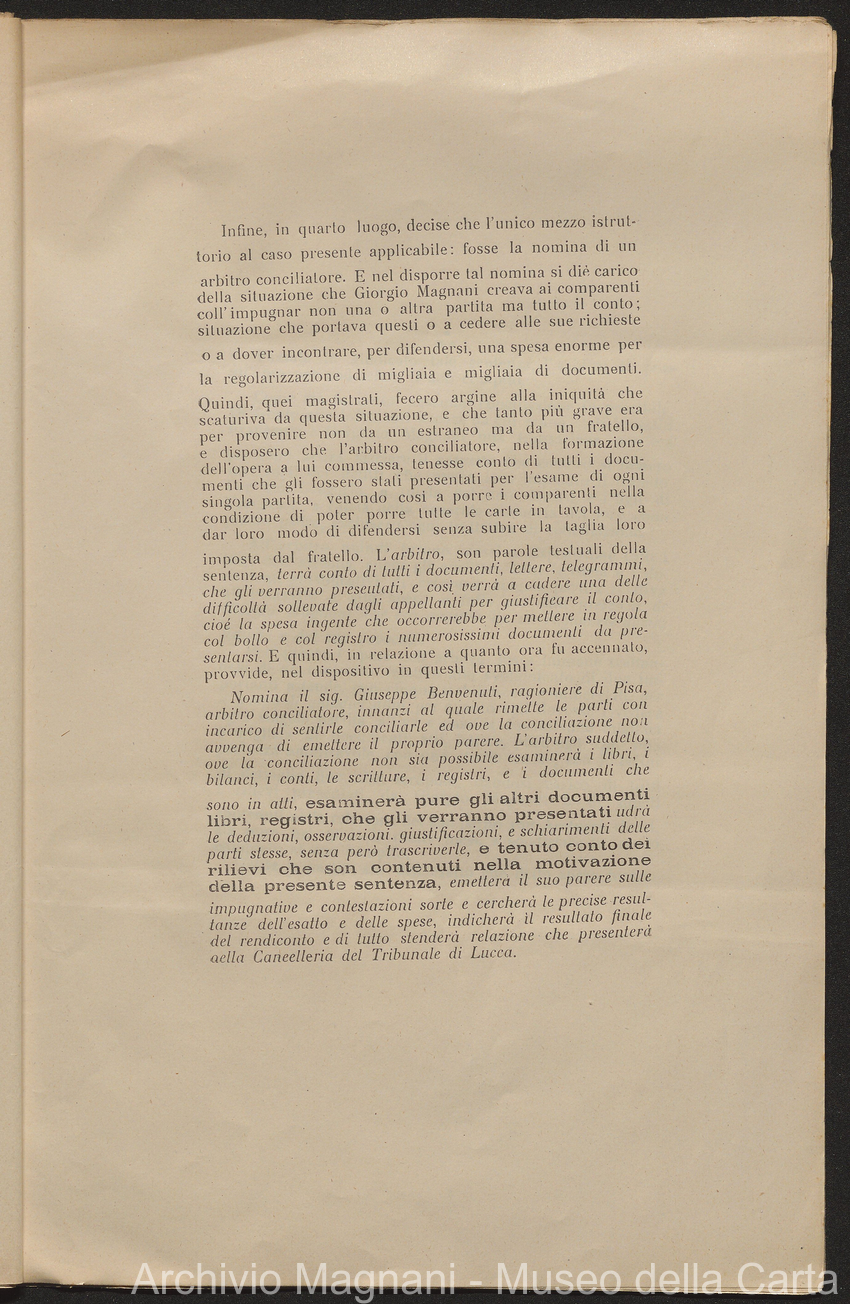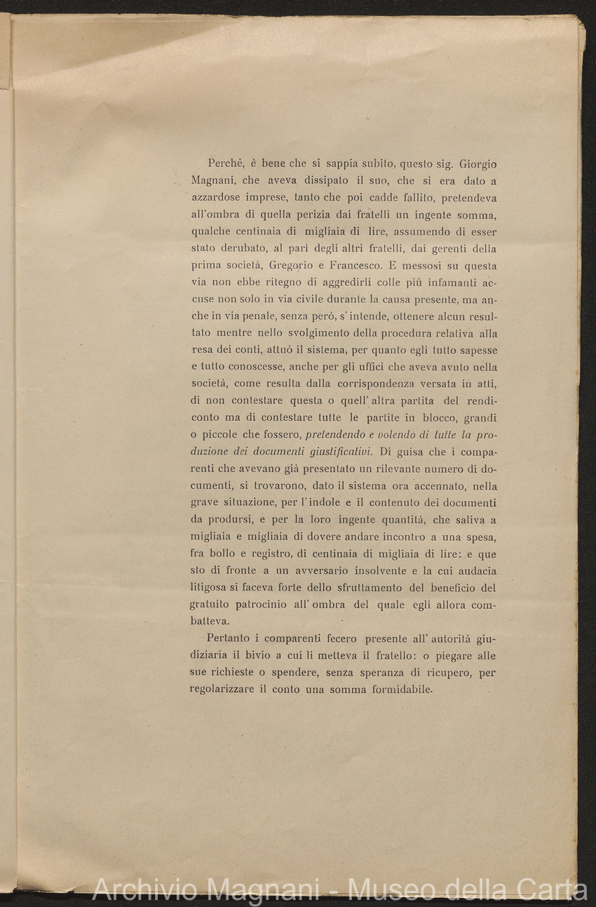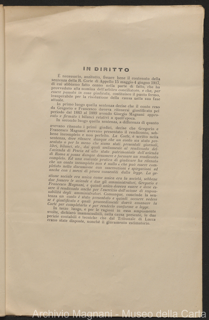 Sentenze a stampa, 1917 e s.d., pp. 2-159; "Cessioni del fallimento di Giorgio", 1913-19, pp. 160-186; "Corrispondenza con l'Avv. A. Galeotti e altri", 1922-32 e 1 s.d. (ante 1927), pp. 187-605; "Enrico Magnani. Carte diverse", 1927 e 6 s.d., pp. 606-622.