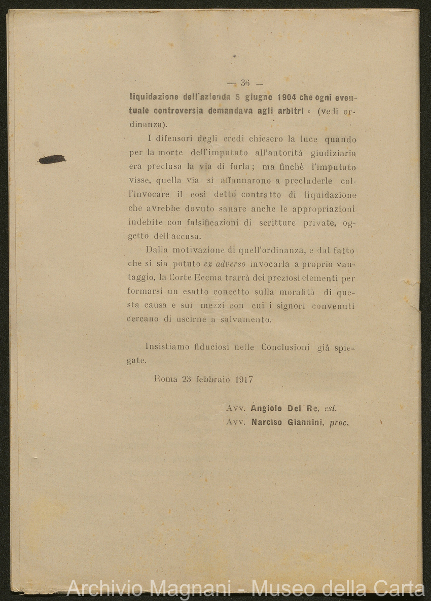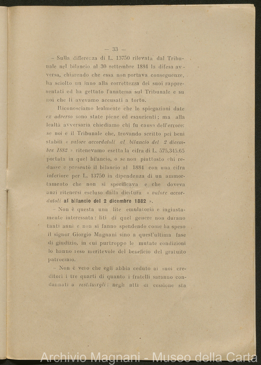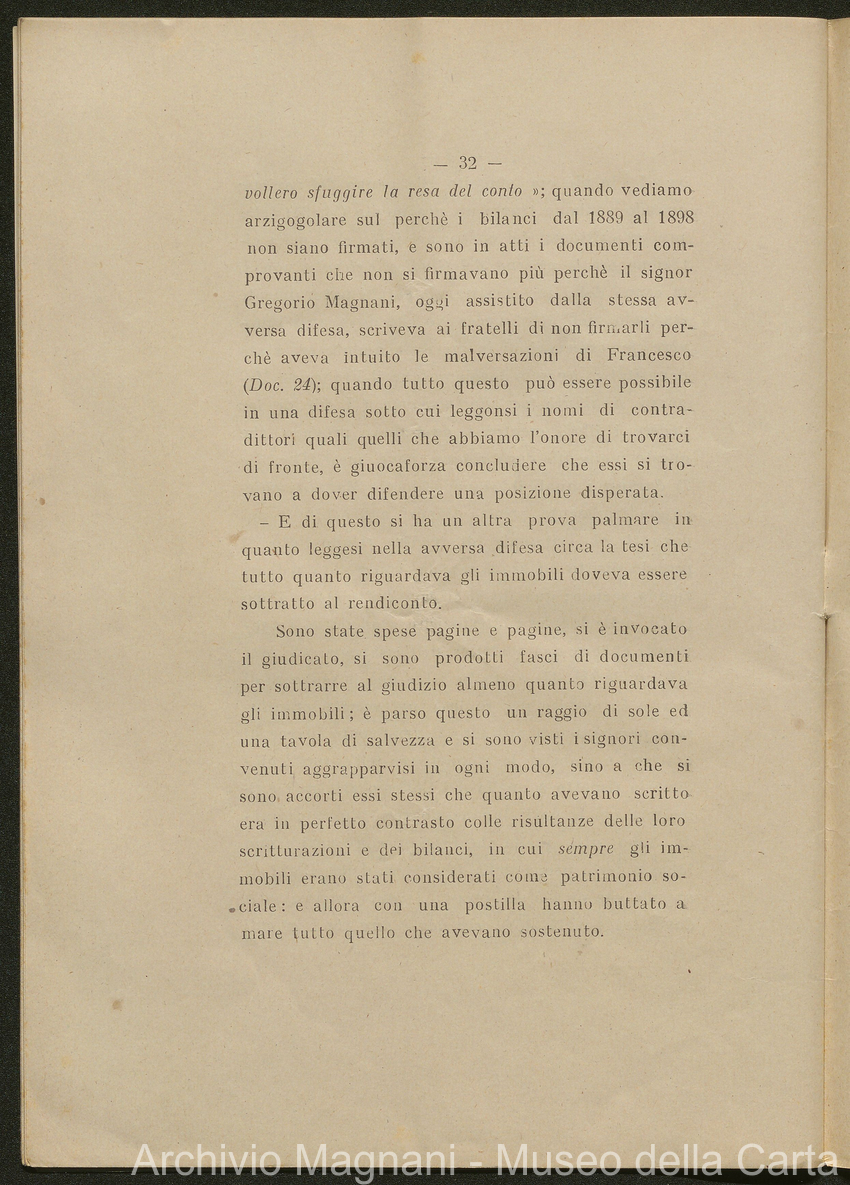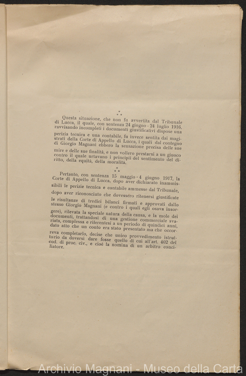 Sentenze a stampa, 1917 e s.d., pp. 2-159; "Cessioni del fallimento di Giorgio", 1913-19, pp. 160-186; "Corrispondenza con l'Avv. A. Galeotti e altri", 1922-32 e 1 s.d. (ante 1927), pp. 187-605; "Enrico Magnani. Carte diverse", 1927 e 6 s.d., pp. 606-622.