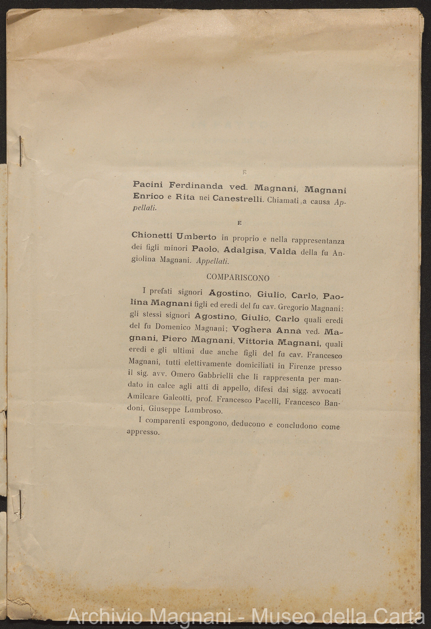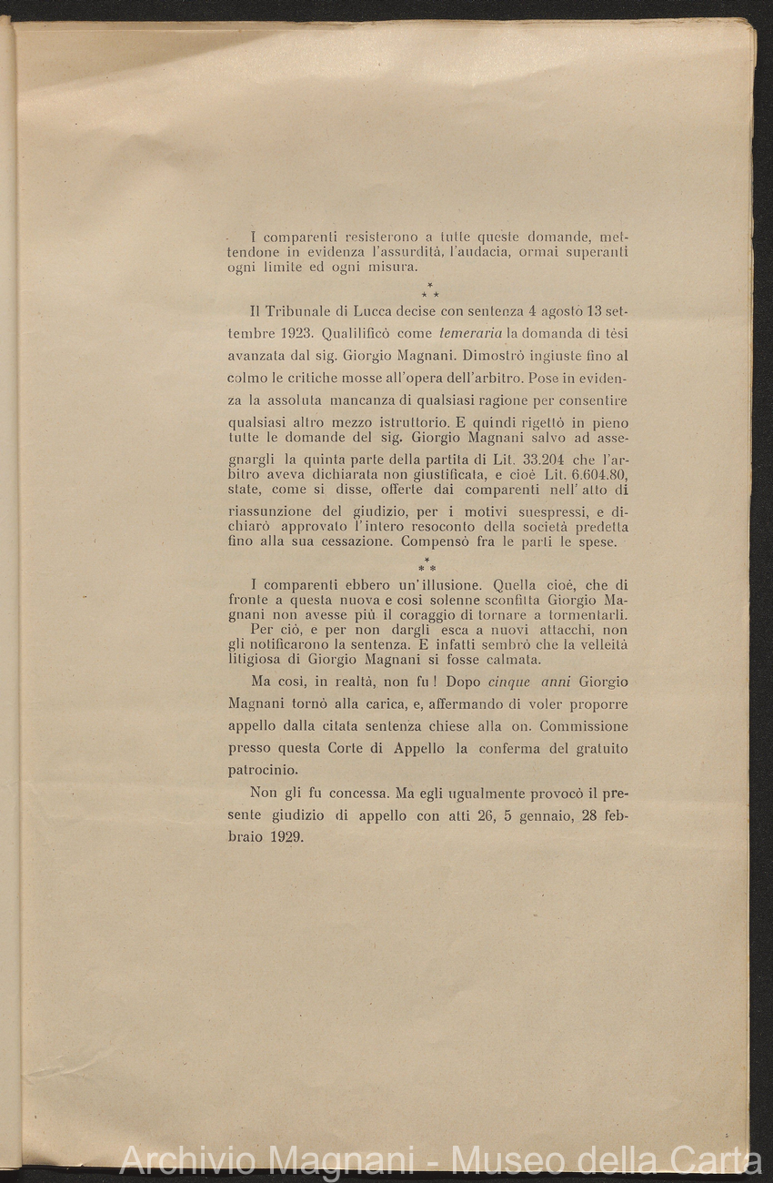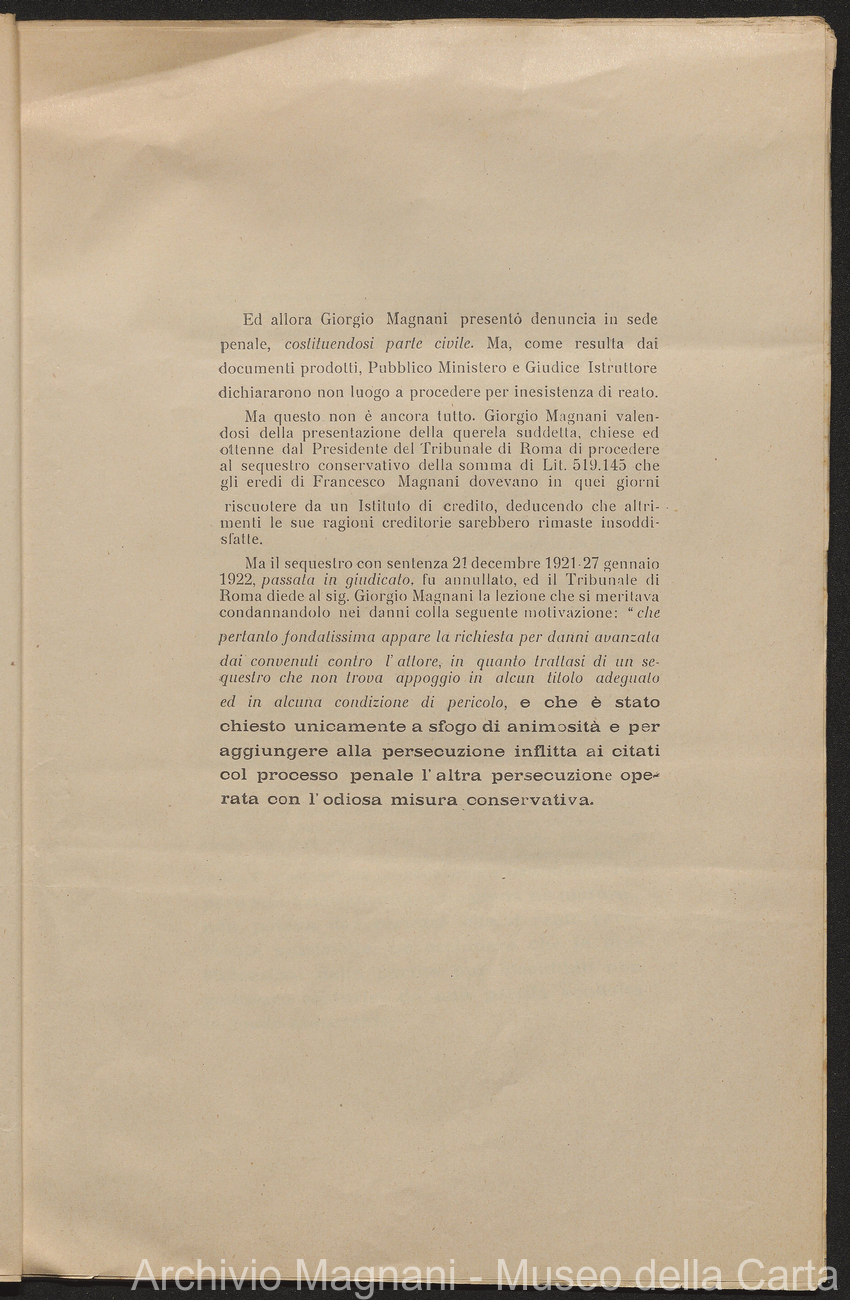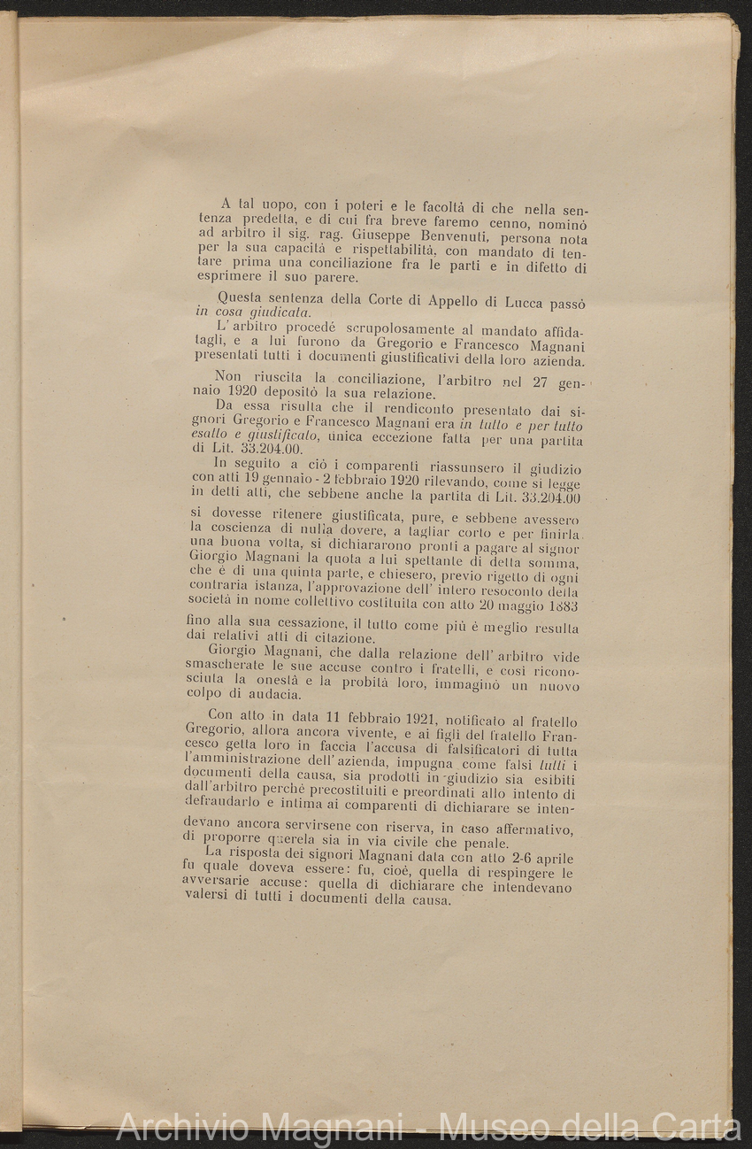 Causa Giorgio Magnani - sentenze - corrispondenza e comparse - Gregorio Magnani - Giuseppe Lumbroso - Giulio Buonamici - Amilcare Galeotti - Francesco Pacelli - Francesco Bandoni - Piero Magnani - Agostino Magnani - Leopoldo Lazzereschi