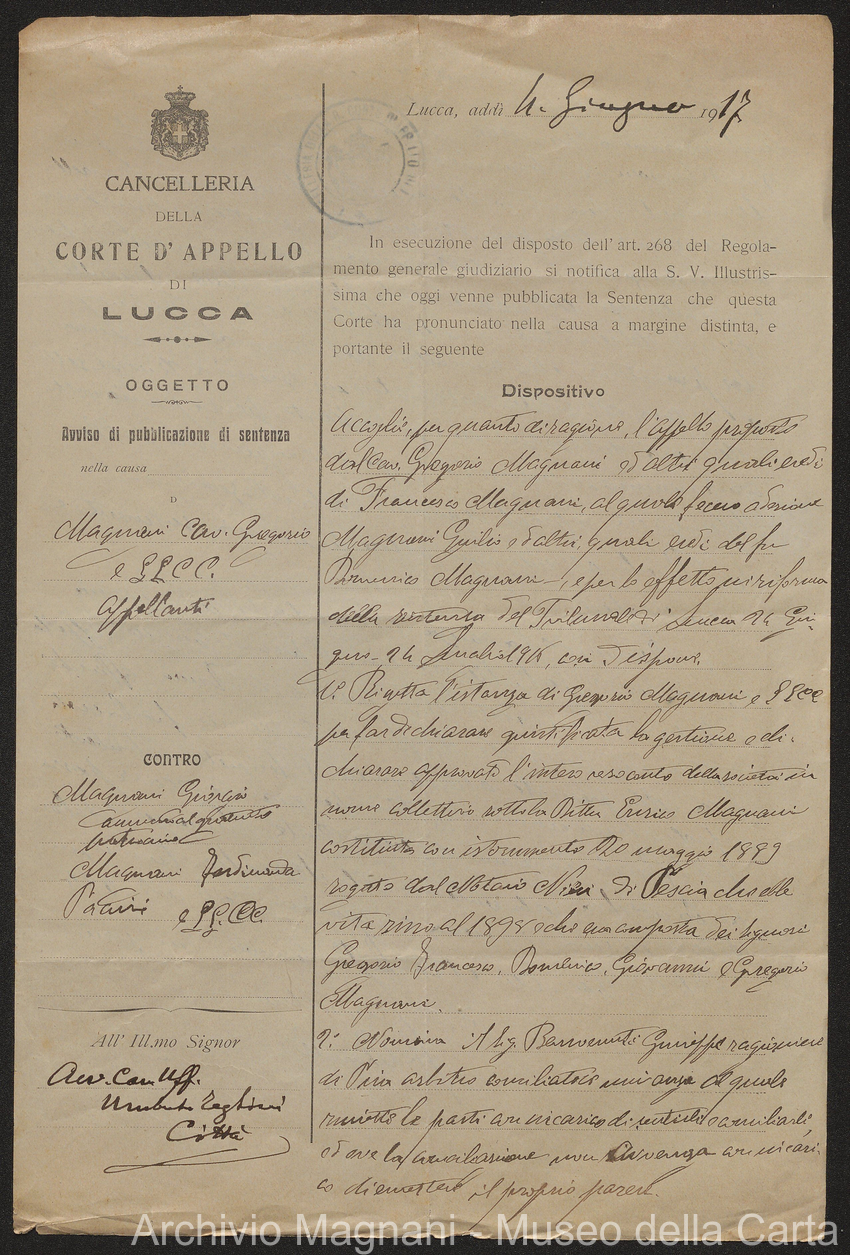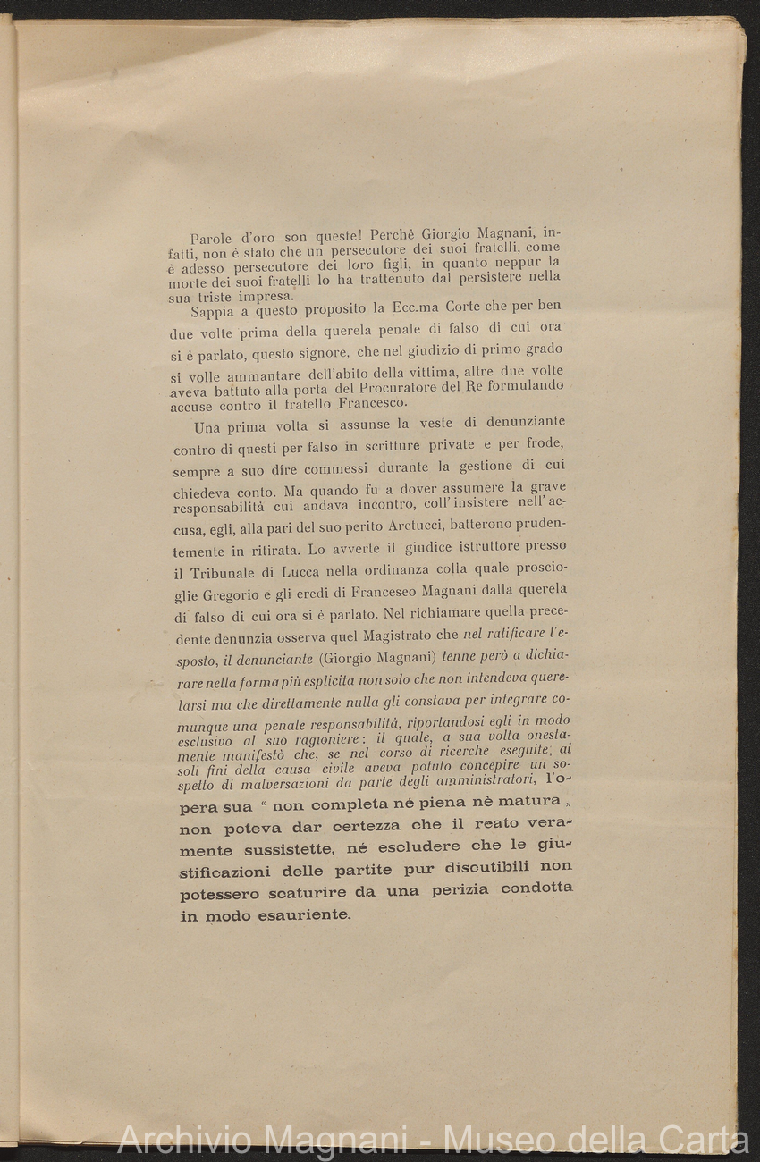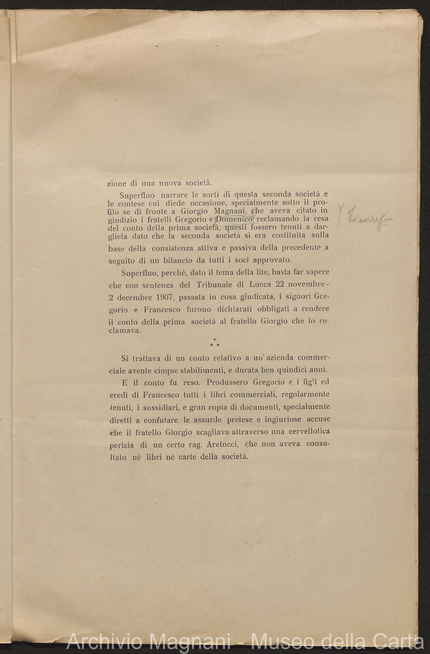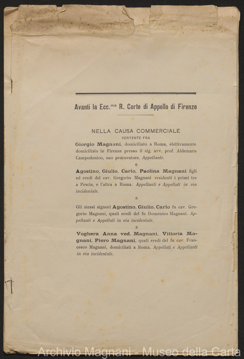 Causa Giorgio Magnani - sentenze - corrispondenza e comparse - Gregorio Magnani - Giuseppe Lumbroso - Giulio Buonamici - Amilcare Galeotti - Francesco Pacelli - Francesco Bandoni - Piero Magnani - Agostino Magnani - Leopoldo Lazzereschi