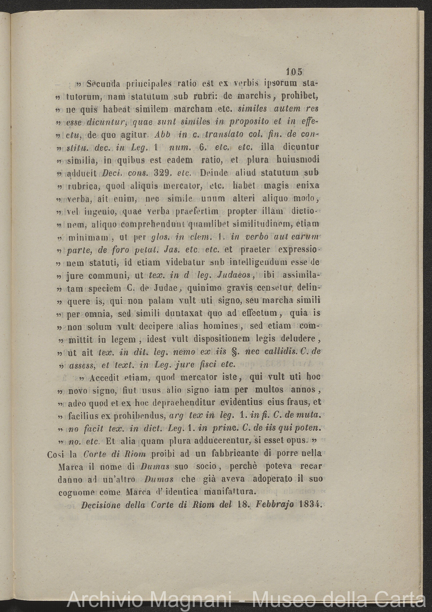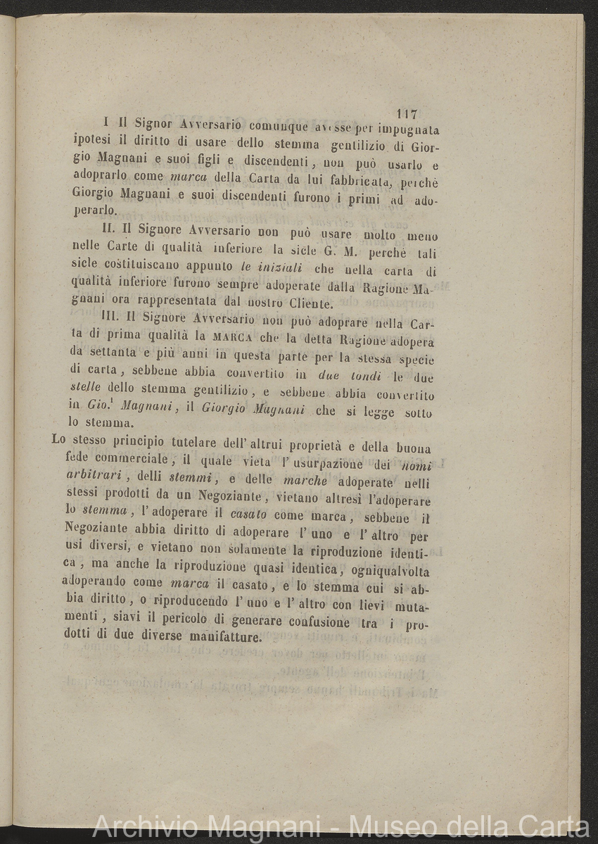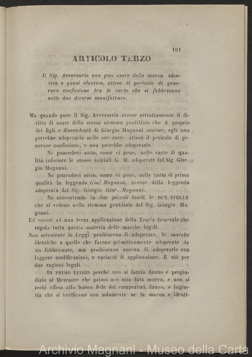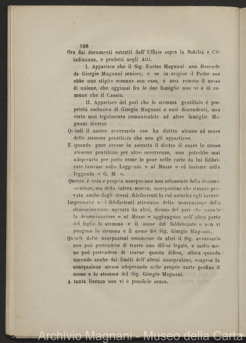 Allegazione di diritto e di fatto a favore del Nobile sig. Giorgio Magnani contro il sig. Enrico Magnani : Emulativa usurpazione di Marca Commerciale / R. Tribunale di prima istanza di Lucca; Firenze : Tipografia Bonducciana; 143 p. ; 28 cm