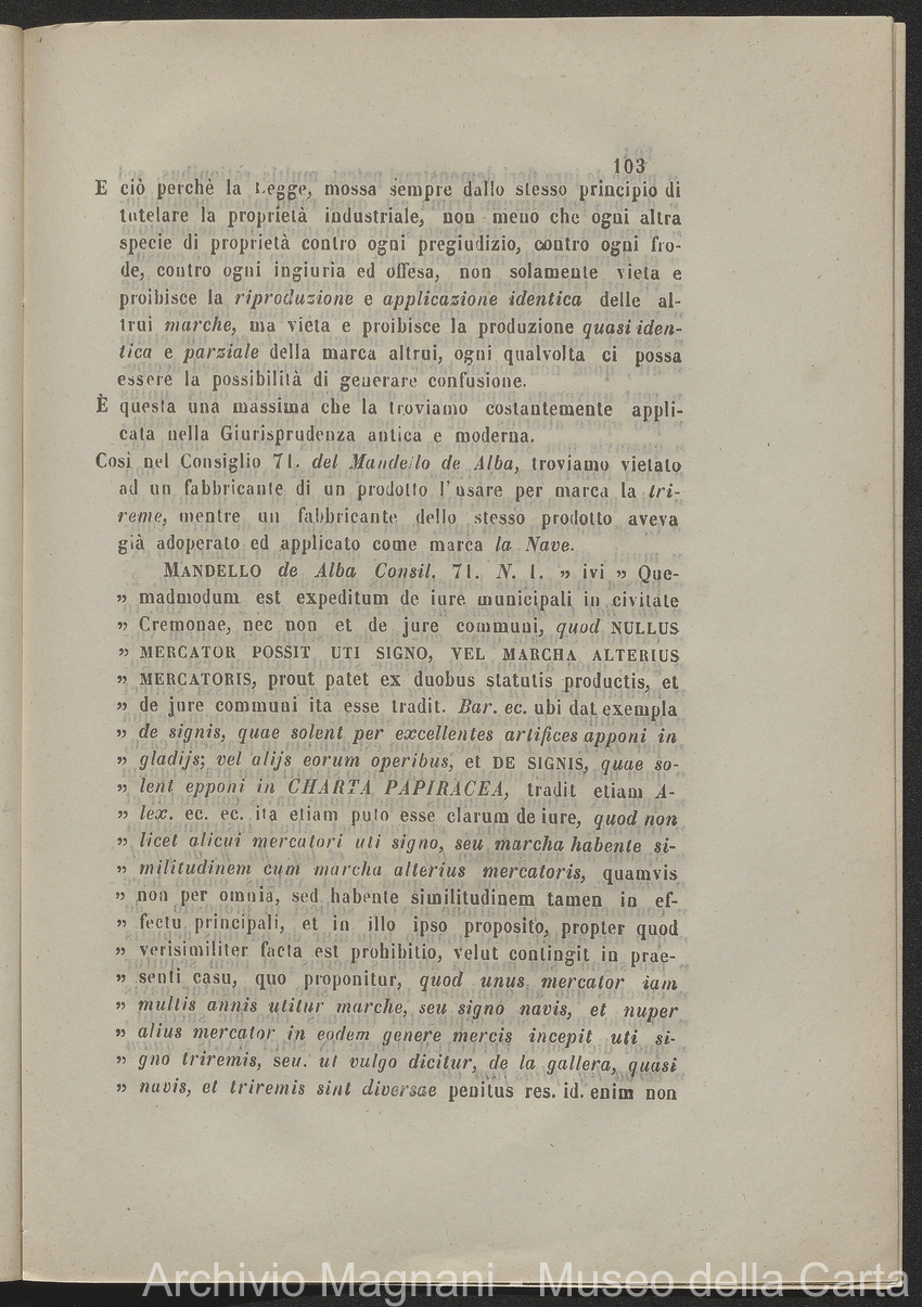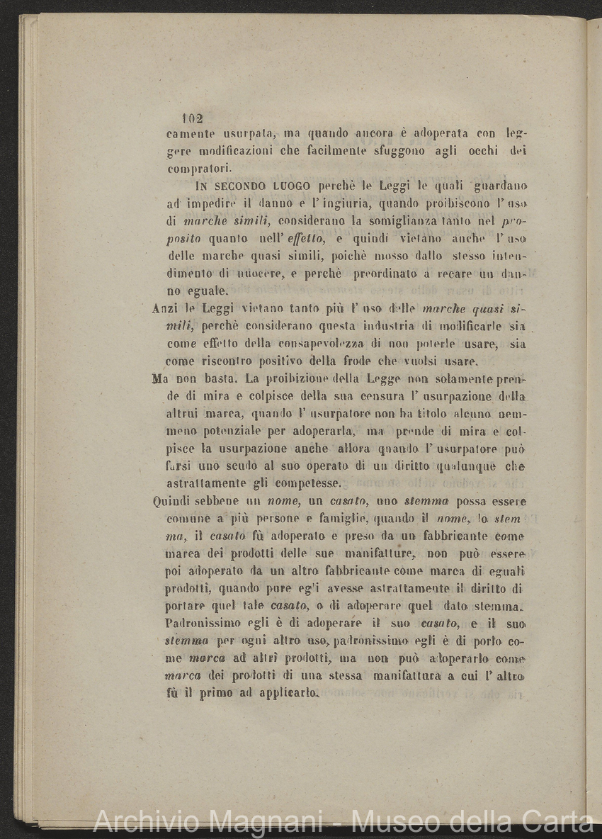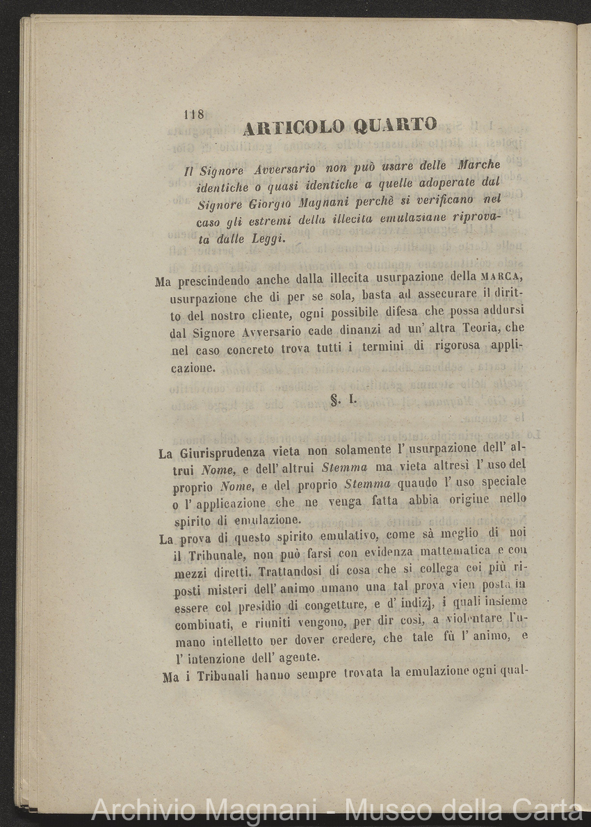Allegazione di diritto e di fatto a favore del Nobile sig. Giorgio Magnani contro il sig. Enrico Magnani : Emulativa usurpazione di Marca Commerciale / R. Tribunale di prima istanza di Lucca; Firenze : Tipografia Bonducciana; 143 p. ; 28 cm