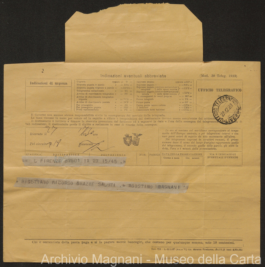 Sentenze a stampa, 1917 e s.d., pp. 2-159; "Cessioni del fallimento di Giorgio", 1913-19, pp. 160-186; "Corrispondenza con l'Avv. A. Galeotti e altri", 1922-32 e 1 s.d. (ante 1927), pp. 187-605; "Enrico Magnani. Carte diverse", 1927 e 6 s.d., pp. 606-622.