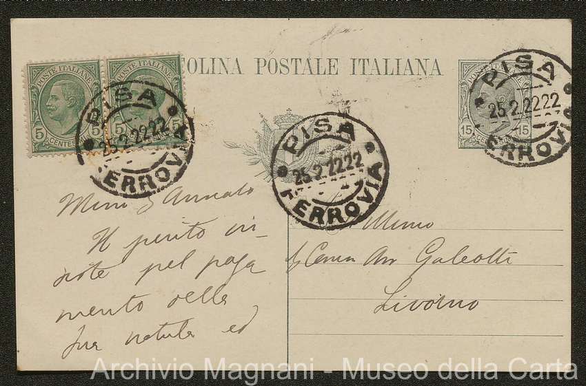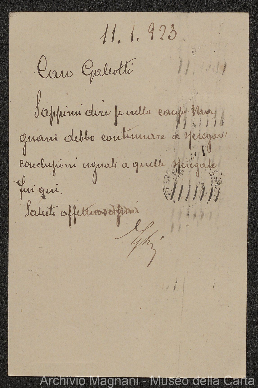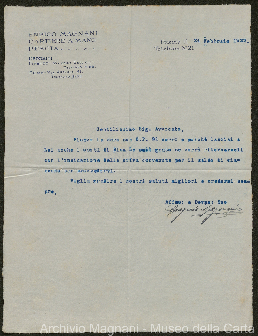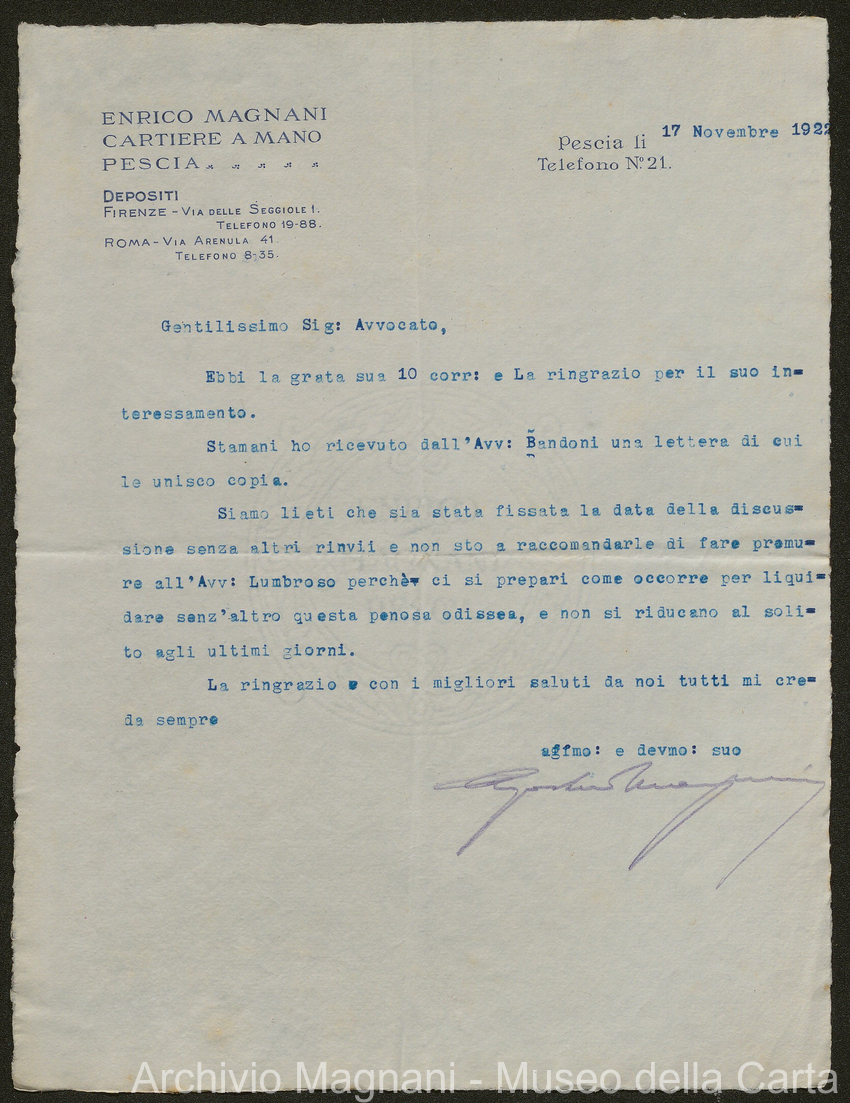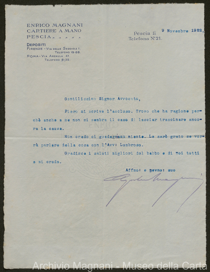 Sentenze a stampa, 1917 e s.d., pp. 2-159; "Cessioni del fallimento di Giorgio", 1913-19, pp. 160-186; "Corrispondenza con l'Avv. A. Galeotti e altri", 1922-32 e 1 s.d. (ante 1927), pp. 187-605; "Enrico Magnani. Carte diverse", 1927 e 6 s.d., pp. 606-622.