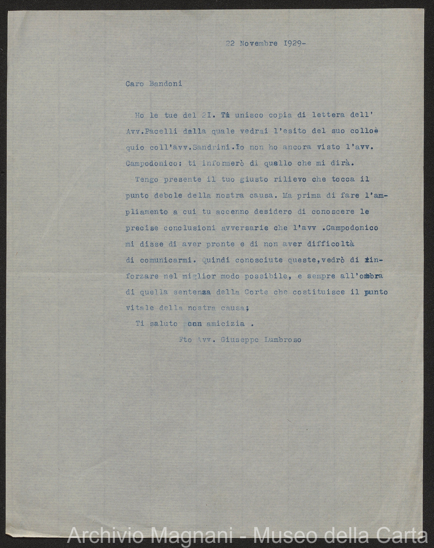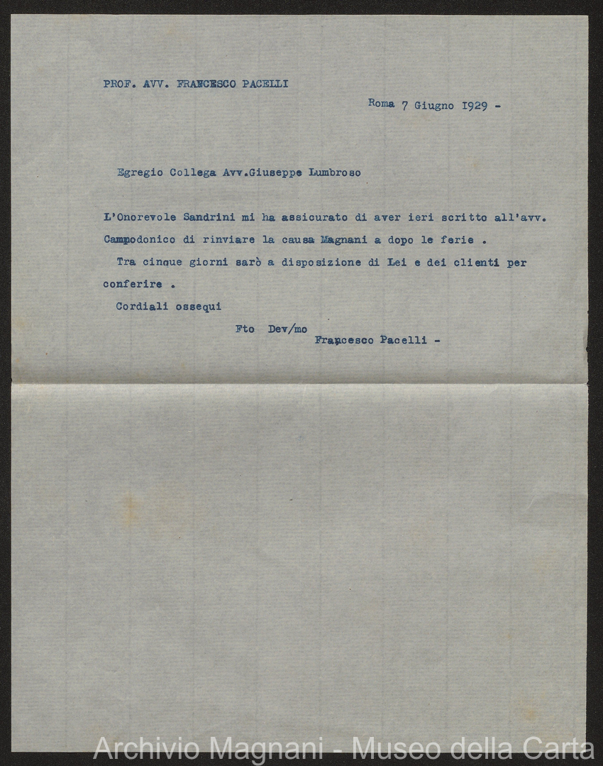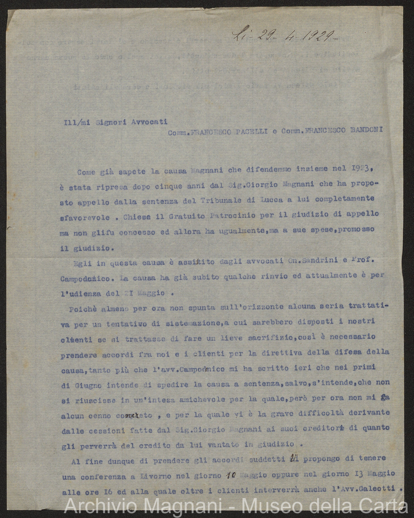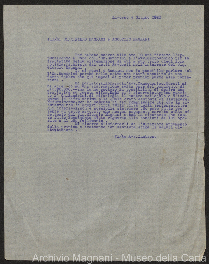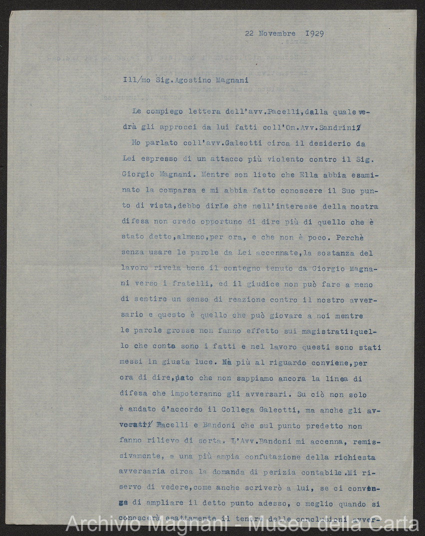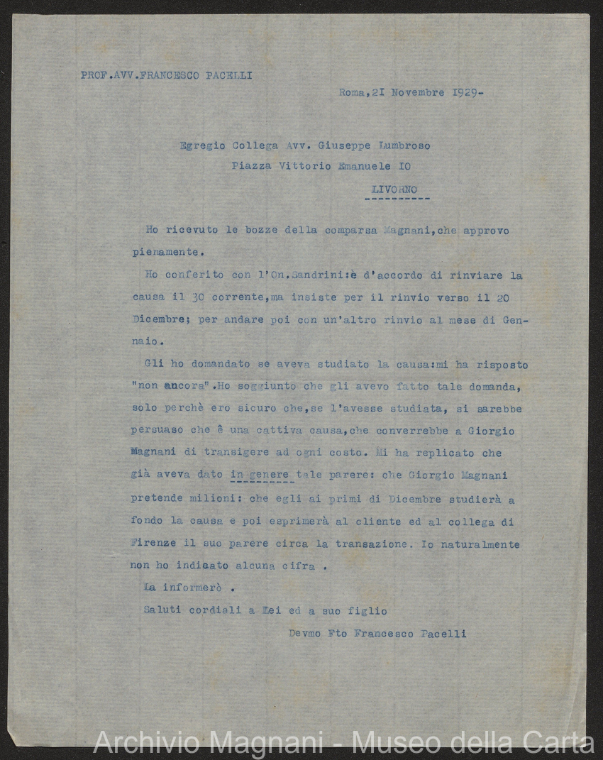 Causa Giorgio Magnani - sentenze - corrispondenza e comparse - Gregorio Magnani - Giuseppe Lumbroso - Giulio Buonamici - Amilcare Galeotti - Francesco Pacelli - Francesco Bandoni - Piero Magnani - Agostino Magnani - Leopoldo Lazzereschi