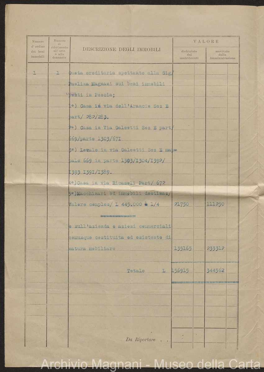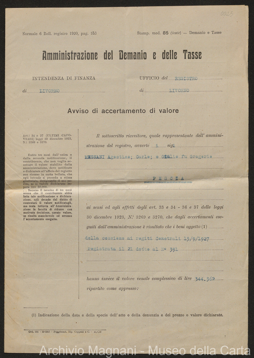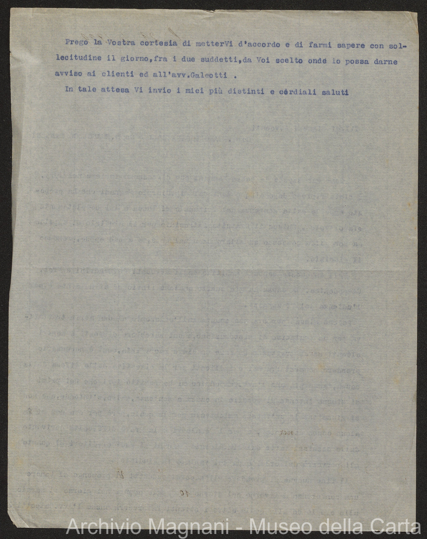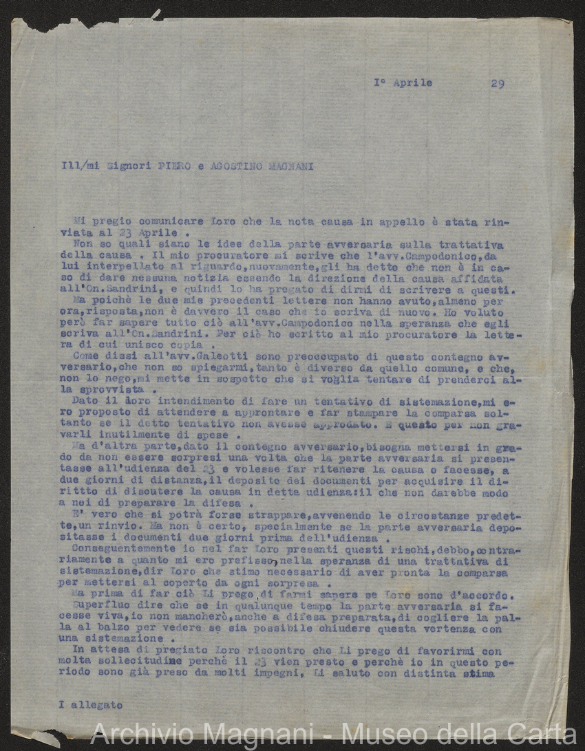 Sentenze a stampa, 1917 e s.d., pp. 2-159; "Cessioni del fallimento di Giorgio", 1913-19, pp. 160-186; "Corrispondenza con l'Avv. A. Galeotti e altri", 1922-32 e 1 s.d. (ante 1927), pp. 187-605; "Enrico Magnani. Carte diverse", 1927 e 6 s.d., pp. 606-622.