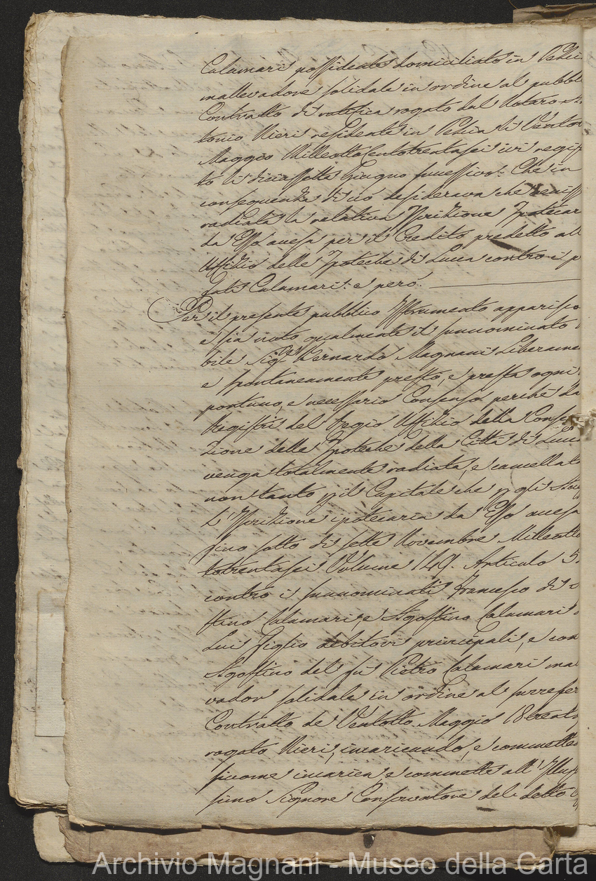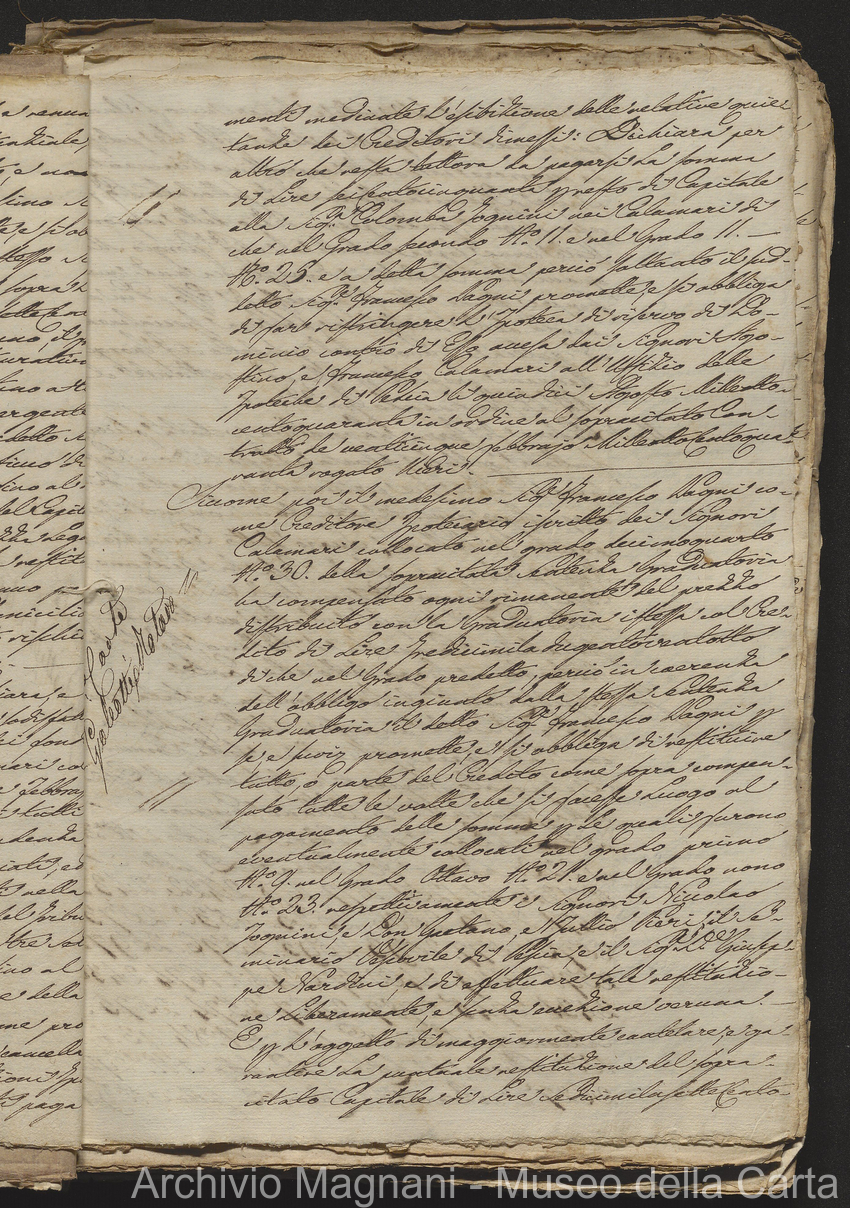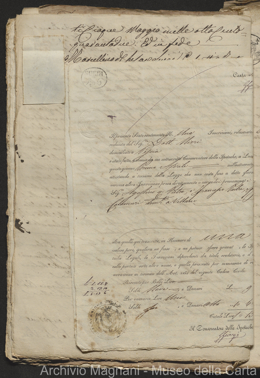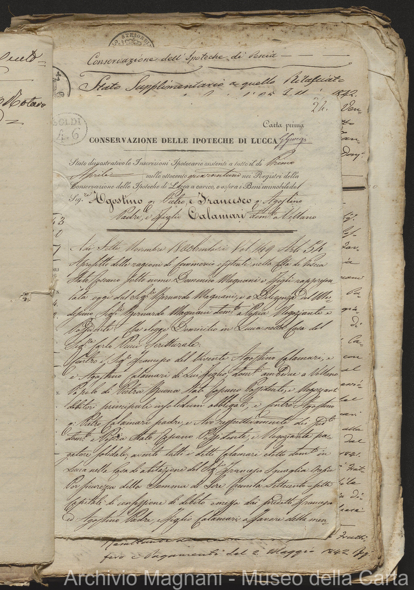 Filza di contr. di prestito, note di credito ipotecario, conserv. ipoteche di Lucca e di Pescia, 2 campioni del catasto (copie), costit. e vendita di censo, cessione di credito, dimostr. graduatoria Calamari, rinuncia; pp. 19-245, di cui XLI bianche
