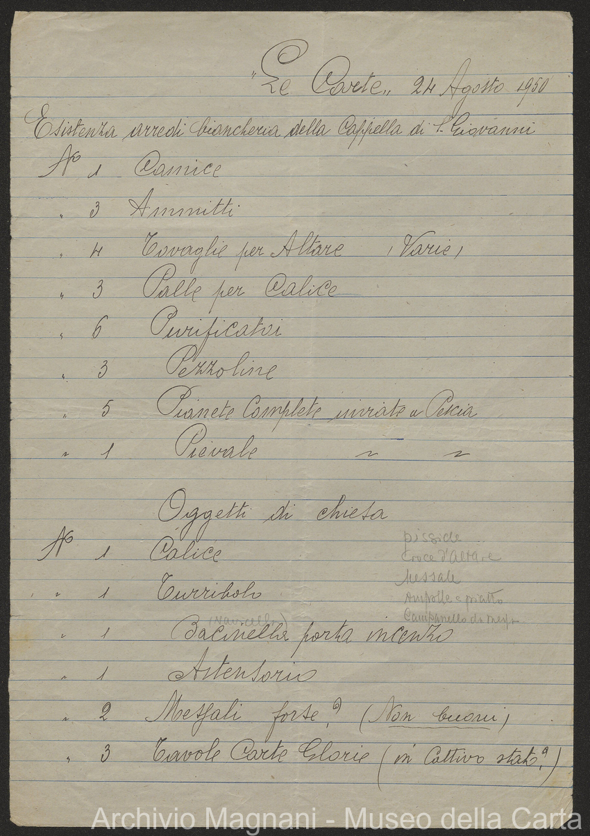 Arredi Cappella S. Giovanni in Pietrabuona (pp. 2-4); notula (p. 6); nota per trascrizione (pp. 8-9); lettera di Simonetti, vescovo di Pescia (p. 23); atto di compravendita (pp. 25-28); busta lettere (all.); pp. 1-28, di cui VI bianche
