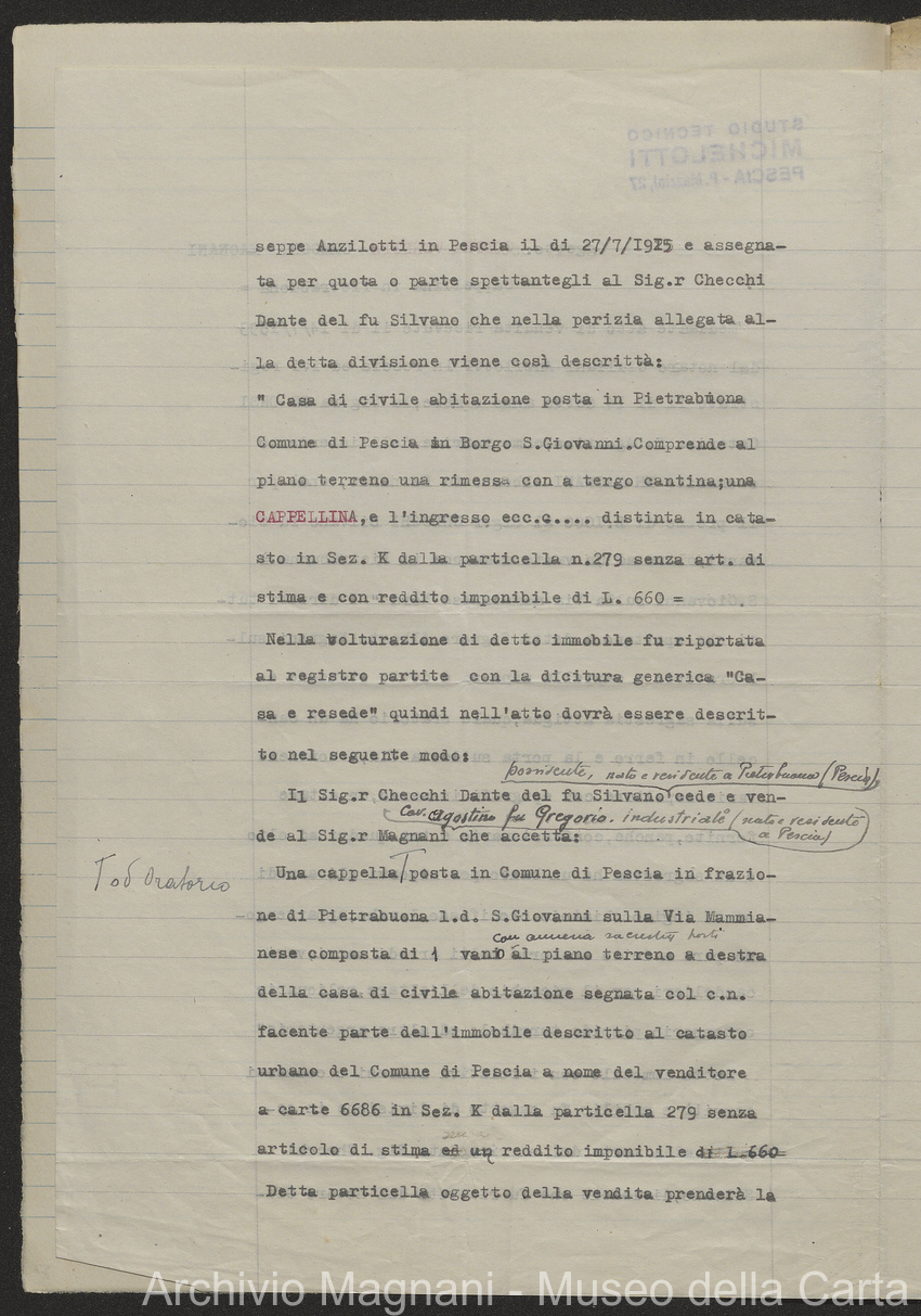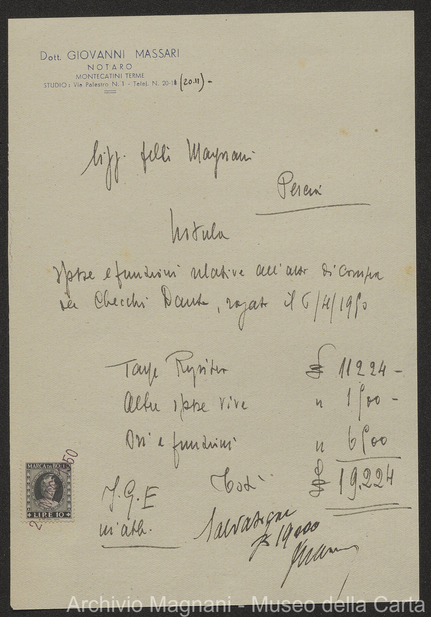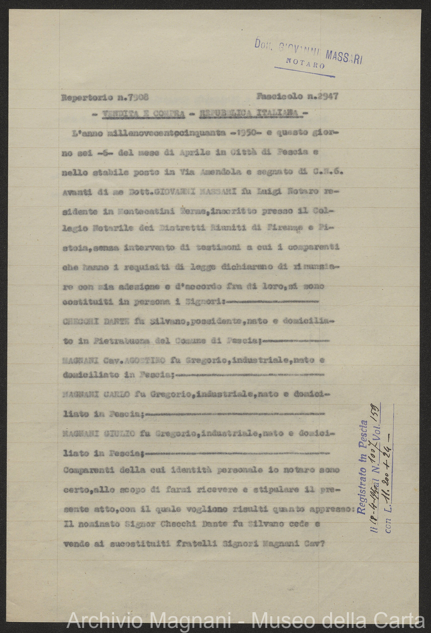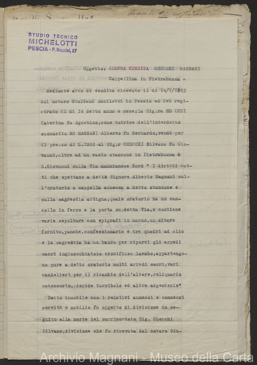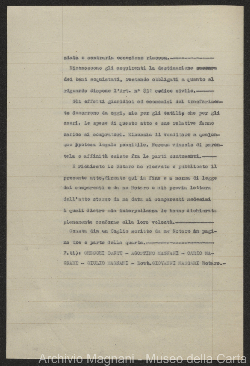 Compravendita - Dante Checchi - Agostino Magnani - Carlo Magnani - Giulio Magnani - B|F I/56 - Petrocchi, avvocato - Angelo Simonetti, vescovo - Giovanni Massari, notaio